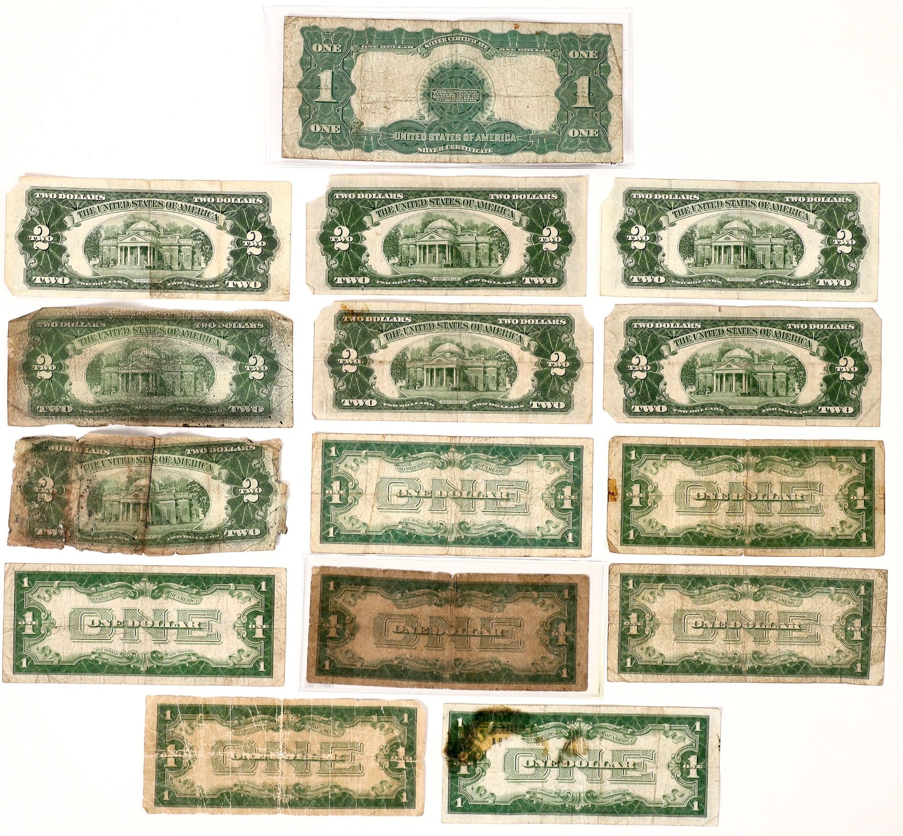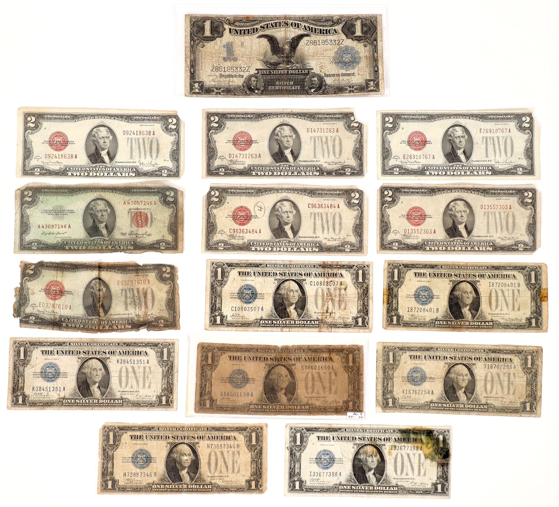 Large size $1 silver certificate, Series of 1899, VG 8; six small size silver certificate one dollar bills, low grade; six two dollar bills, mostly low grade.