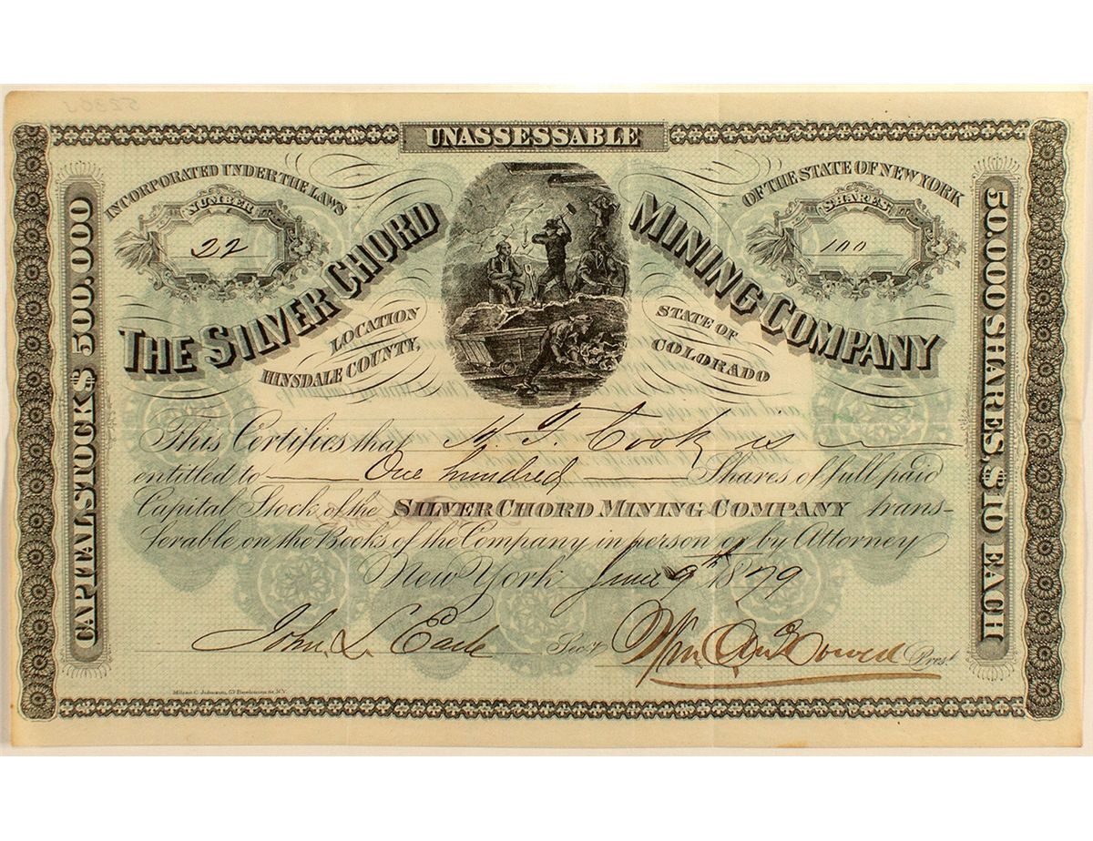 Rare. Inc. in New York. No. 22. Uncancelled. Issued for one hundred shares to H.F. Cook. Dateline New York, June 9, 1879. Signed by Wm. McDowell (president) and John L. Earle (secretary). Vignette at center of miners working underground. Location Hinsdale County, State of Colorado. Black border and print with green safety print. Printed by Milton C. Johnson, NY. Reverse is signed by Cook. Folds. Very nice certificate. Measures 9 ½” x 6”City: County: HinsdaleState: CODate: 1879