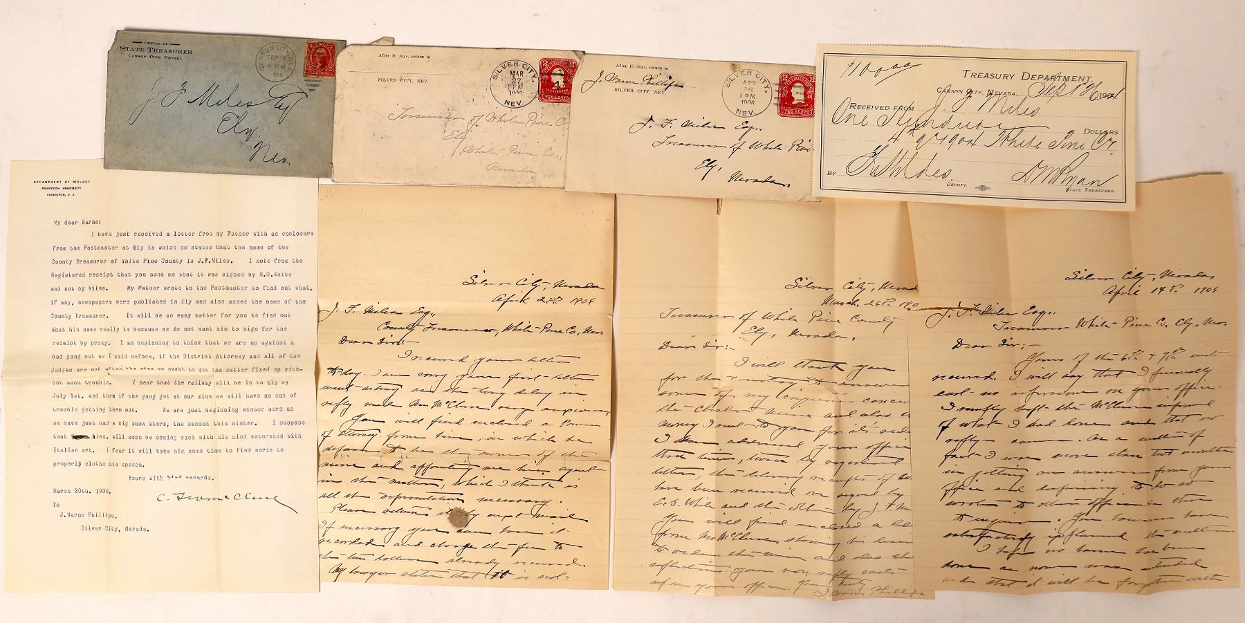 Three covers: two 1906 strong Silver City and one 1904 Carson City wit State Treasurer cc. Letter with it says, “…if the District Attorney and all of the judges are not after the mine we ought to get the matter fixed up without much trouble.” “I am beginning to think we are up against a bad gang.…” “ I hear the railway will be in Ely by July 1st.” Three Silver City letters also. (W. D. Miles Collection)