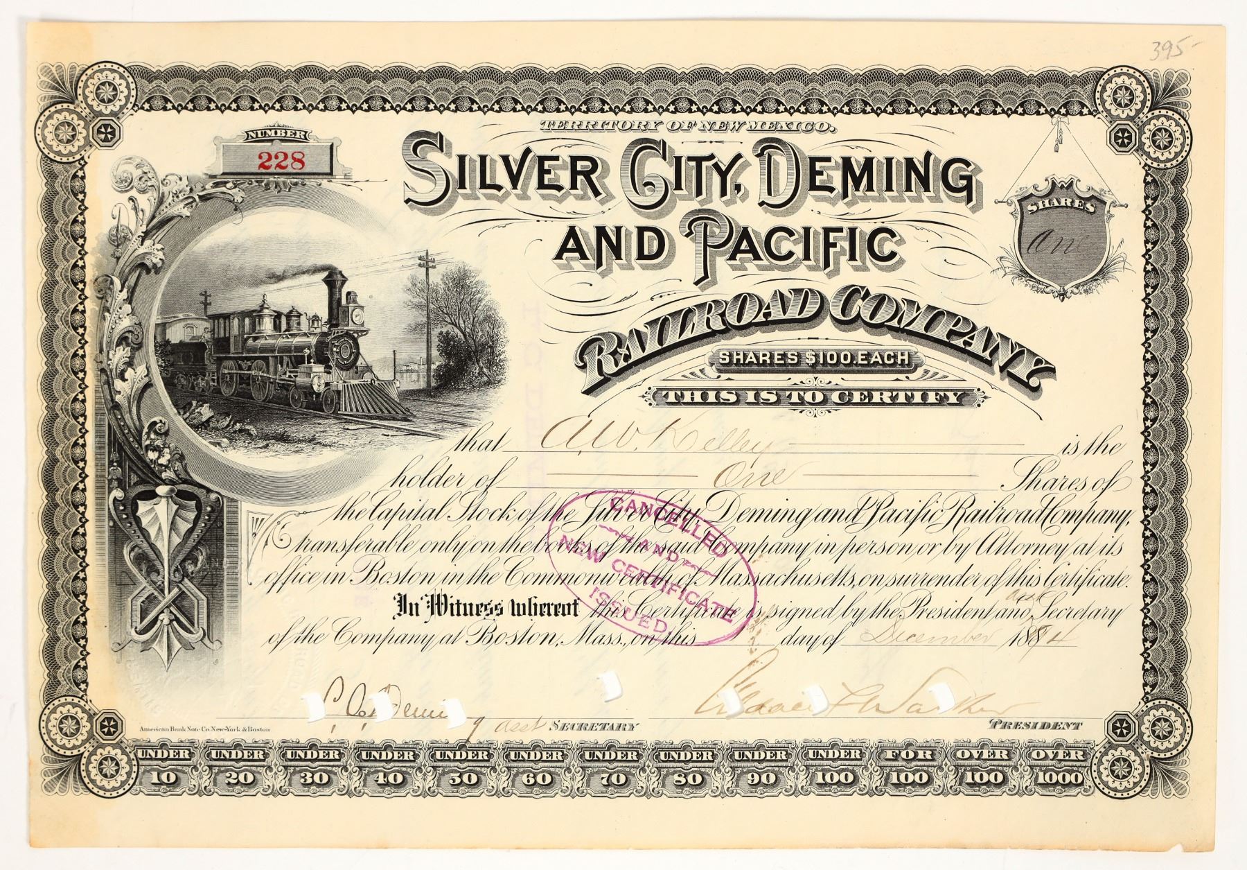 Very rare! Territory of New Mexico. No. 228, issued for one share to AW Kelley in 1894. Signed by the president and secretary. Punch cancelled. Locomotive vignette. ABN. A 47-mile narrow-gauge railroad, the Silver City, Deming and Pacific Railroad, reached Silver City from Deming in March 1883. Within a year it was acquired by the Santa Fe, which converted the 3-foot gauge line to standard gauge by May 1886.