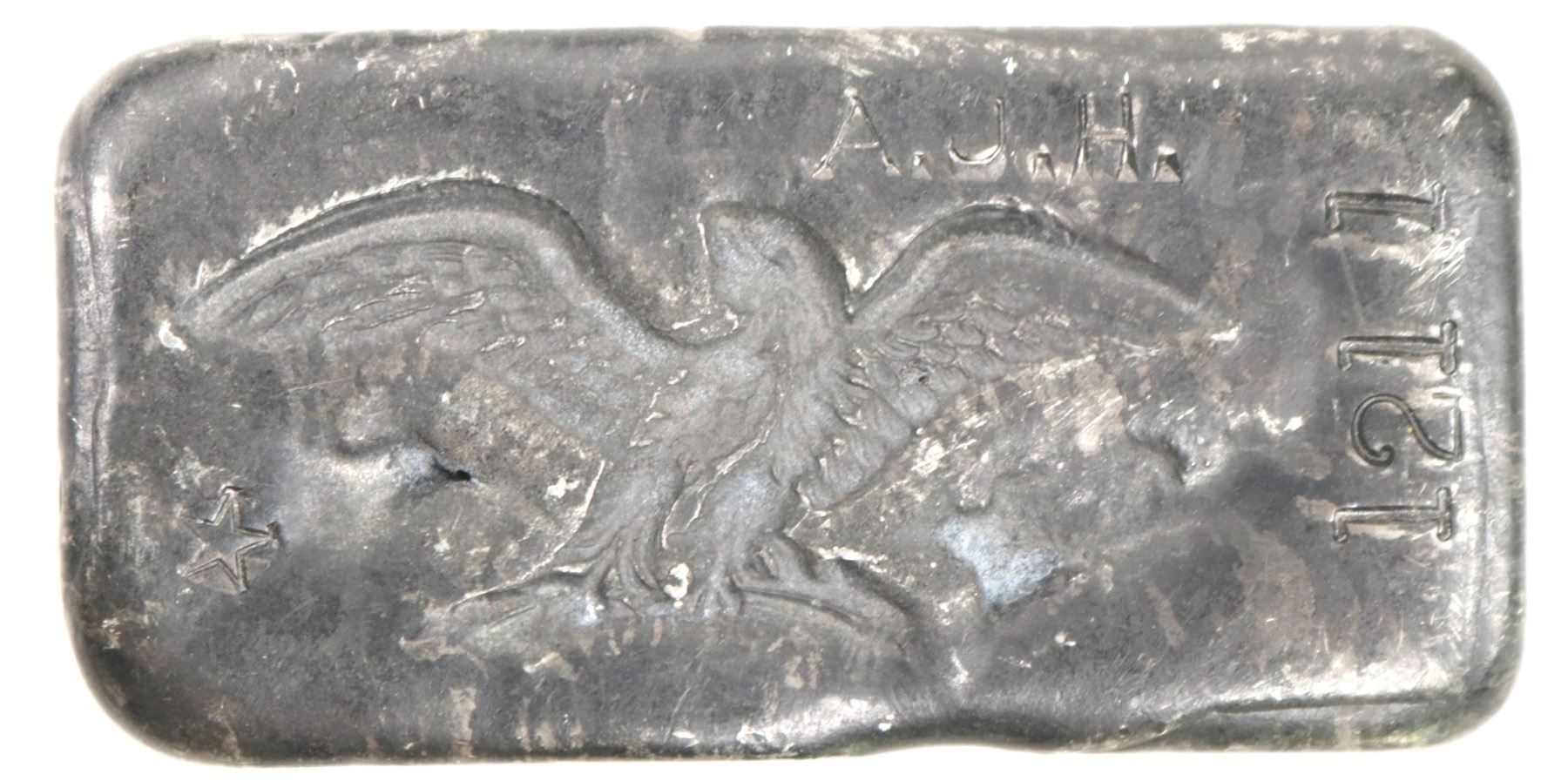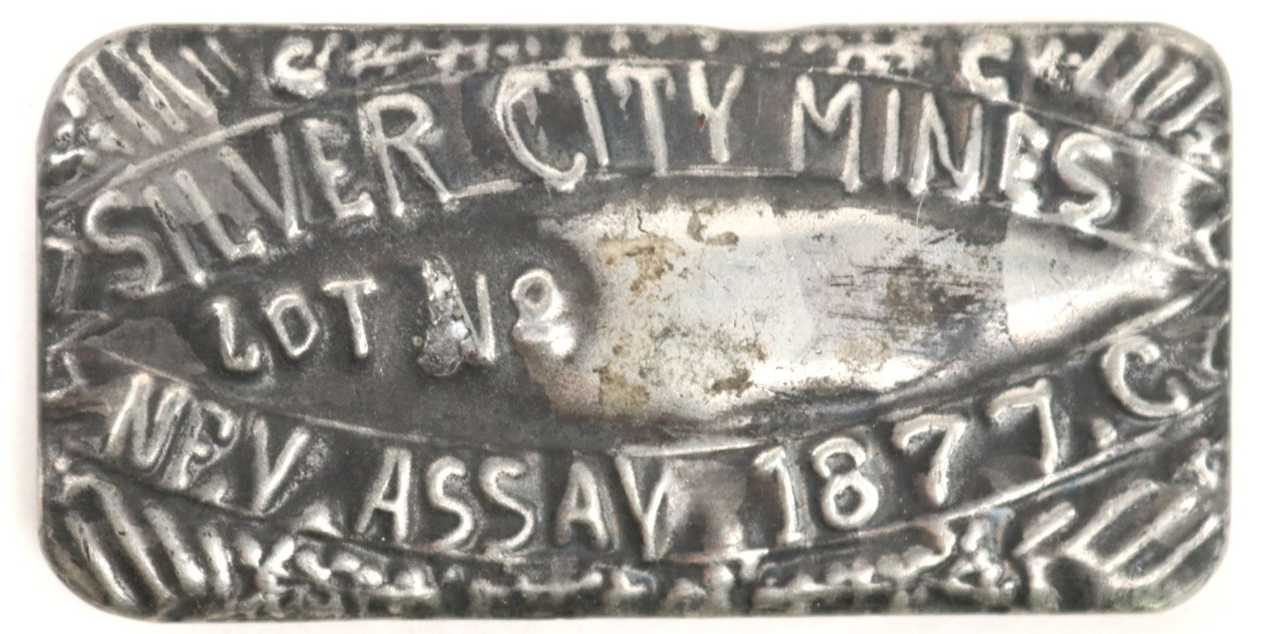 Fantasy ingot, 2 1/2 x 1 1/4 inches, 96.3 grams. Stamped: Silver City Mines / Lot No. / Nev. Assay 1877.C. Not silver.