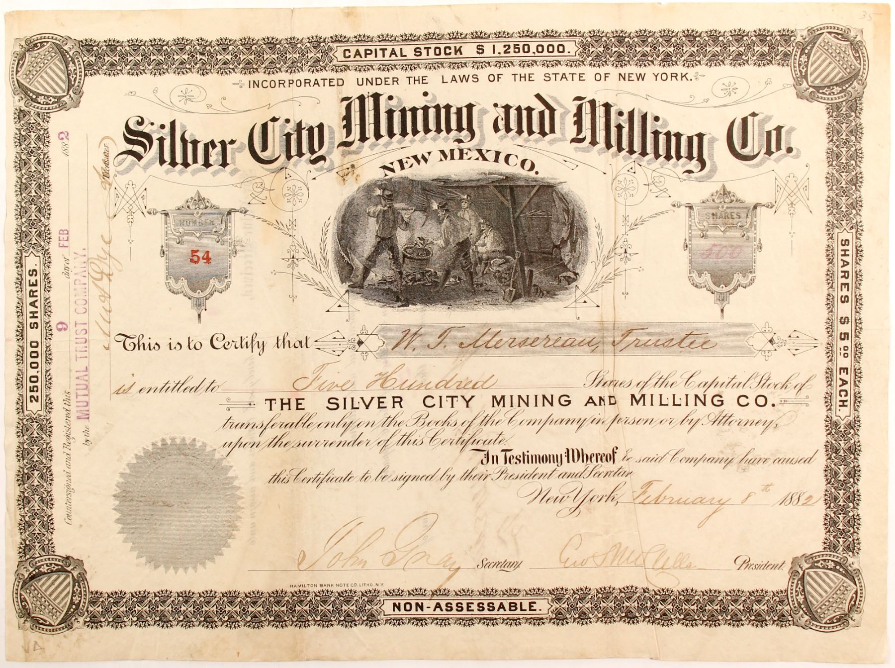 Five hundred shares of Silver City Mining and Milling Company incorp. under the laws of New York capital stock certificate number 54, issued to W. T. Uersereau, trustee, dated February 8, 1882. Printed: Hamilton Bank Note & Co. Litho. Ken . Ken Prag Collection