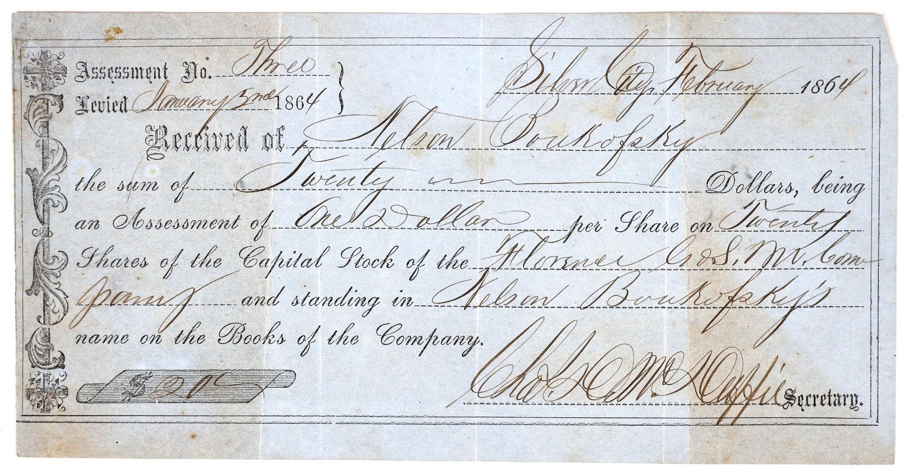 Rare Silver City territorial piece. Dateline Silver City, February 1864. Assessment to Nelson Boukofsky for one share of Florence G&S Mining Co. stock. Signed by secretary Chas. McDuffie. Black print on blue paper. 3.5 x 7" Company is listed in Collins 1864 directory as being in the RR Mining District. Possibly the Railroad District?