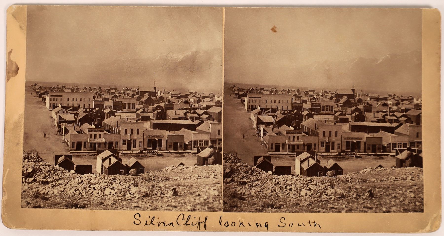 c1882. "Silver Cliff looking South" printed at bottom. Purple stamp for "Charles E. Emery, Portrait and Landscape Photographer, Silver Cliff, Colo." on reverse. Note on back that "The church, I guess was Presbyterian, was where I married." Some discoloration. Edge issues that do not affect the photos. Contrast is sharp and clear! "Charles Emery was an early photographer in Canon City. He was born in Sweden in 1859, emigrating to the United States in 1867. He learned photography from his adoptive father, A.G. Emery, who had a studio in Silver Cliff. He began his career in Silver Cliff before moving to Canon City and opening a shop at 510 Main Street in 1885. On August 14, 1886, an ad was placed in the Canon City Record by Emery listing images for sale. The 129 images were Views of Rocky Mountain Scenery which included Canon City, Manitou Springs, and Silver Cliff among others." [Royal Gorge Regional Museum].