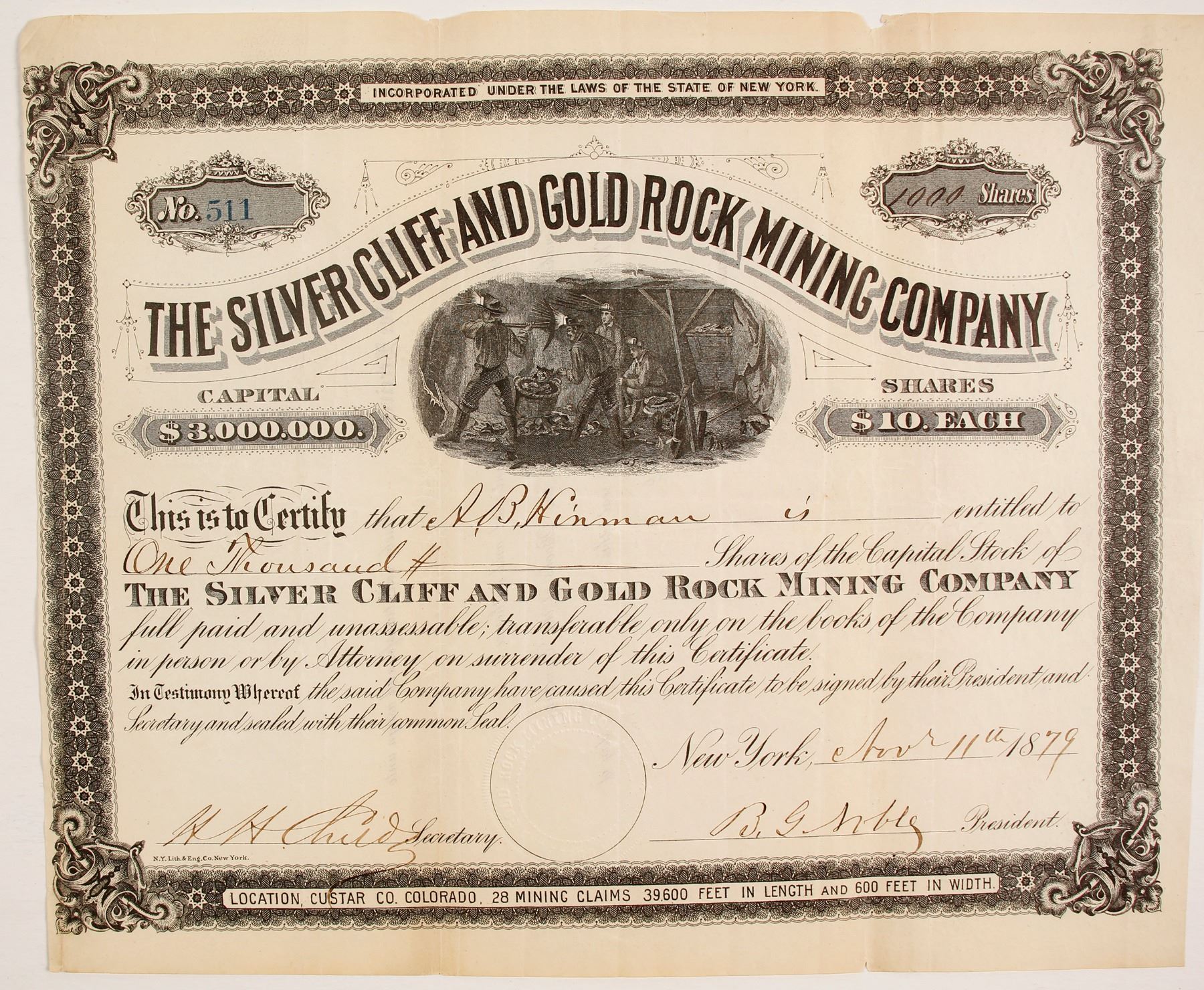 # 511 for 1000 shares to AB Kinman. Signed by HH Child and president BG Noble. Dateline New York, 1879. "Location, Custer Co., Colorado. 28 mining claims. 39,600 feet feet length and 600 feet in width." Underground mining vignette. N. Y. Litho. Border rips and tears. Ken Prag Collection