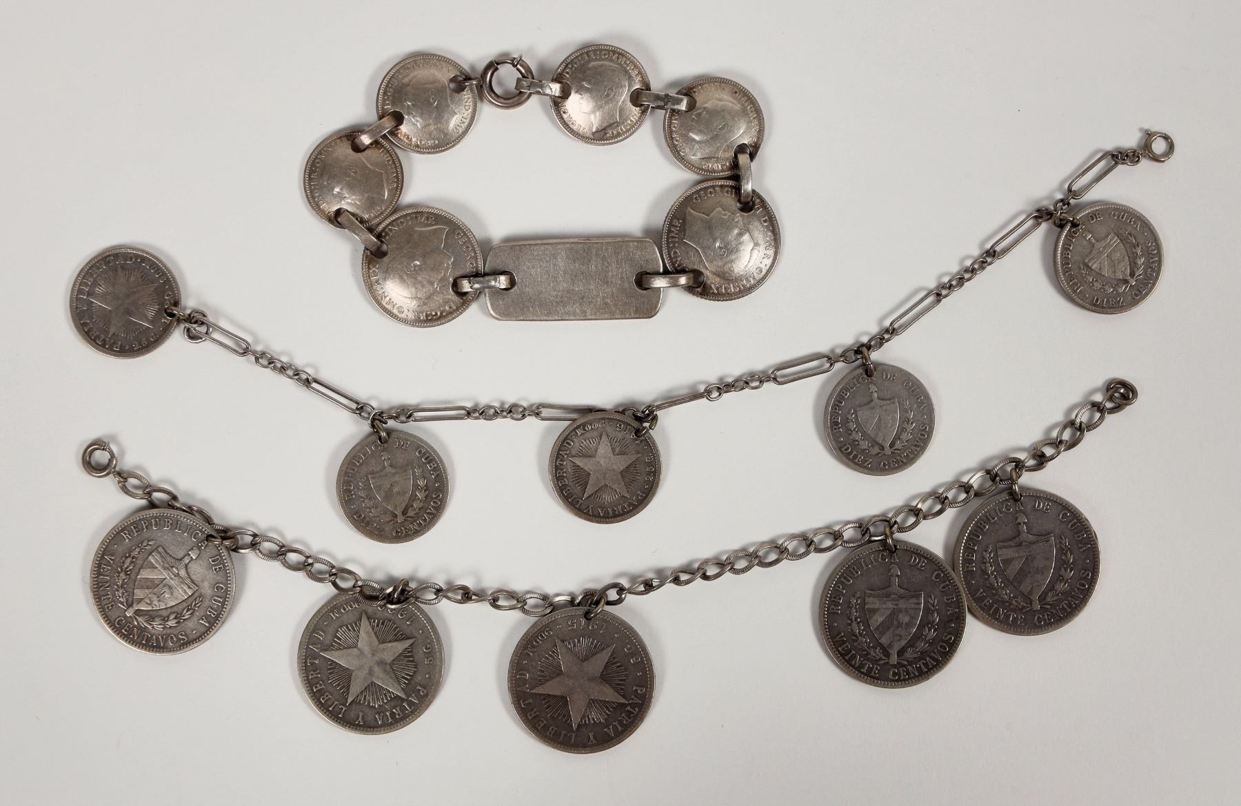 Three bracelets made with silver coins: 1) five Cuban twenty centavo coins dated 1915 & 1920; seven inches long; 2) five Cuban diez centavo coins dated 1915, 1916, 1920; 7 inches long; 3) six English three and six pence, joined with a rectangular silver piece; 4 inches long.