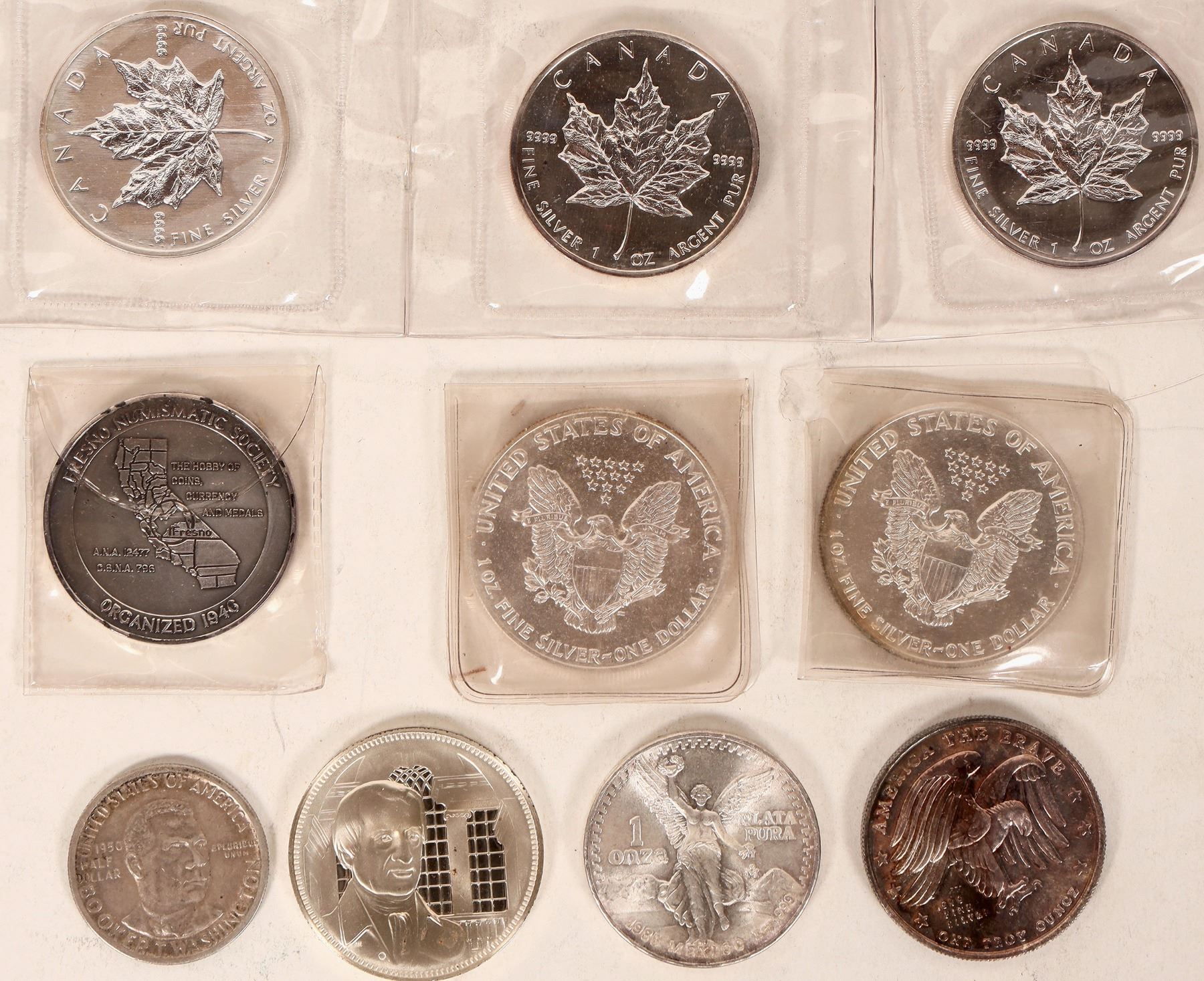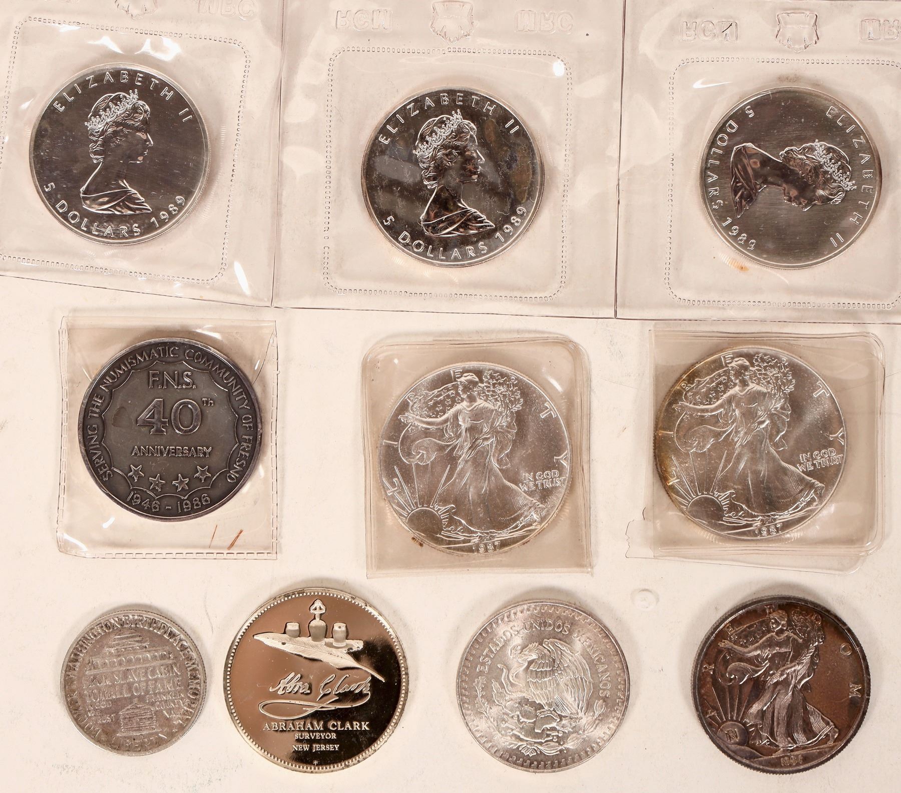Assortment of silver bullion coins: two 1987 BU American Eagle silver dollars; three 1989 Canadian five dollar silver maple leafs, in original Royal Canadian Mint packaging, BU; 1985 Mexican one ounce plata pura; 1984 Freedom one ounce silver round, fashioned after the American Eagle; 1986 Fresno Numismatic Society, 999 silver one ounce round; Abraham Clark, Surveyor' sterling silver Bicentennial medal; 1950-S Booker Washington commemorative half dollar, F-EF condition.