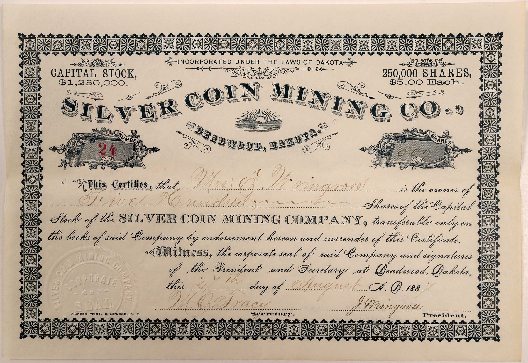 I/U #24 E Wingrose 500 shares 1887. Signed by President Wingrose who may have operated an early Deadwood grocery store.