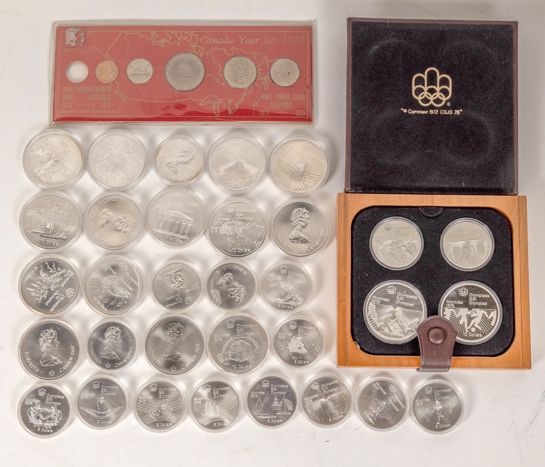 Lot of 32 uncirculated silver coins from the 1976 Montreal Olympics: 16 $10 coins (1.44 oz. each); 16 $5 coins (0.72 oz. each). Over 34 ounces of silver. Also a 1973 Canada year set. Canada 1976