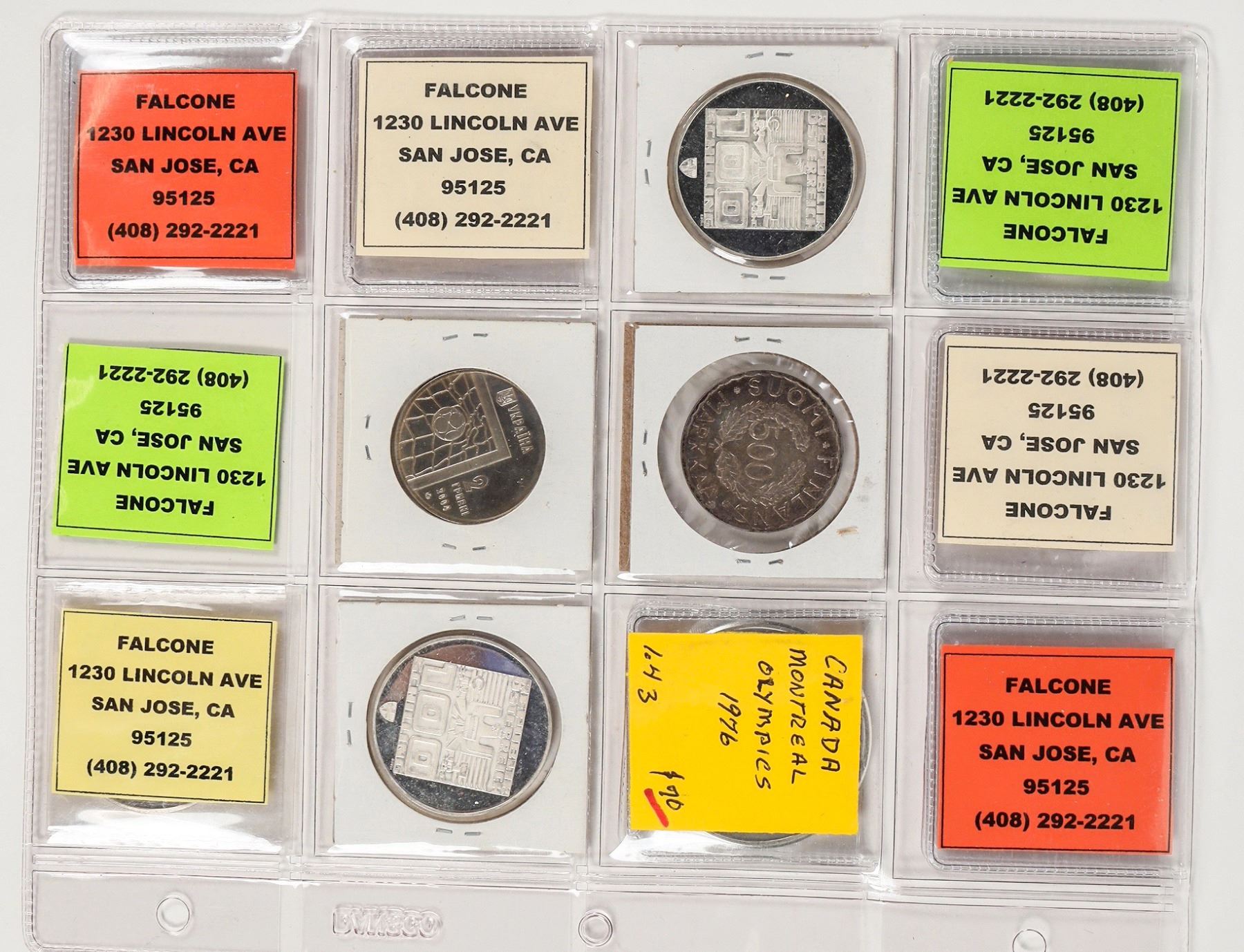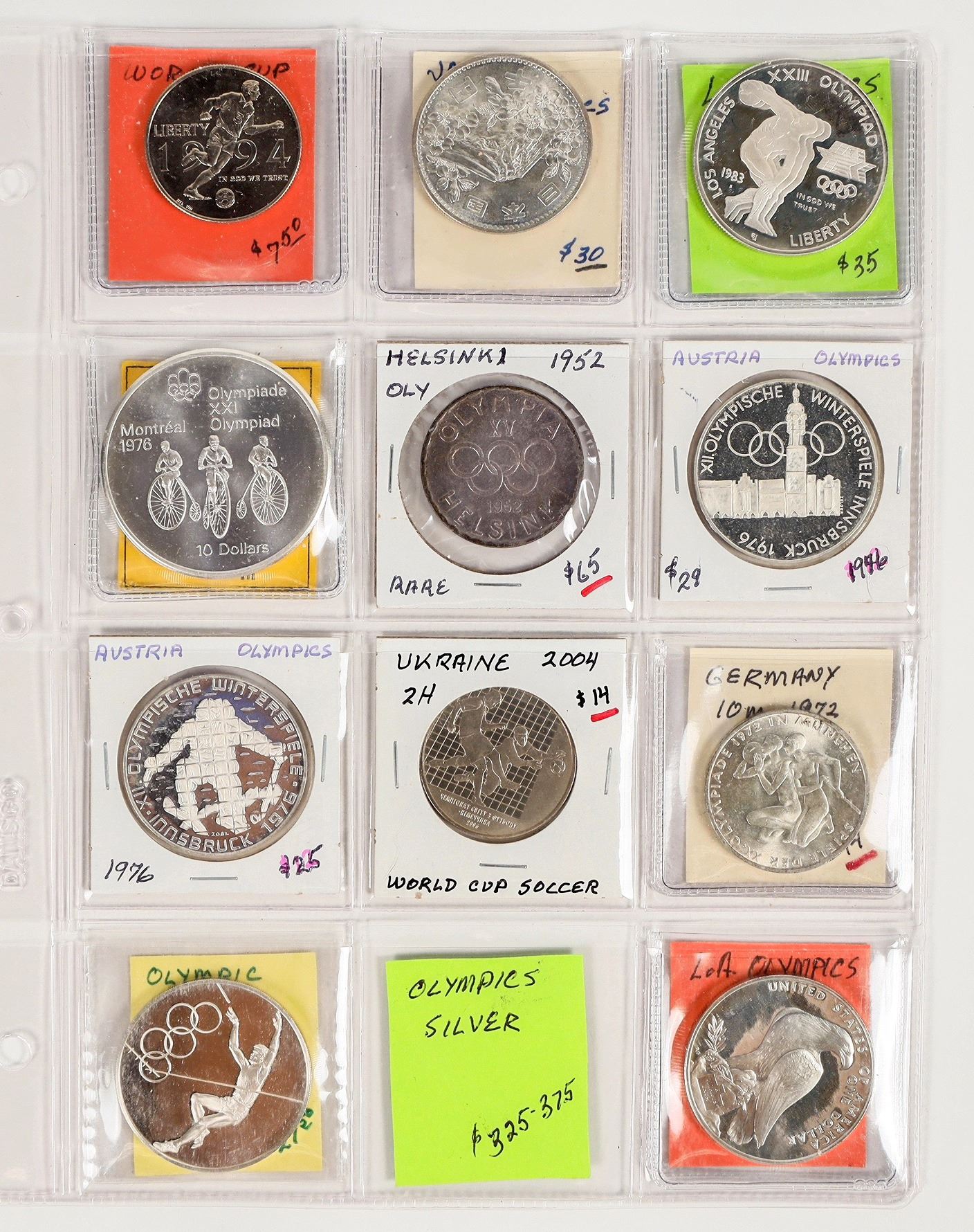 Eleven silver coins from various countries commemorating some aspect of the Olympics. Countries include USA, Germany, Japan, Finland, Austria, Ukraine, and Canada. Various years, diameters, weights, and denominations. See photos for details.