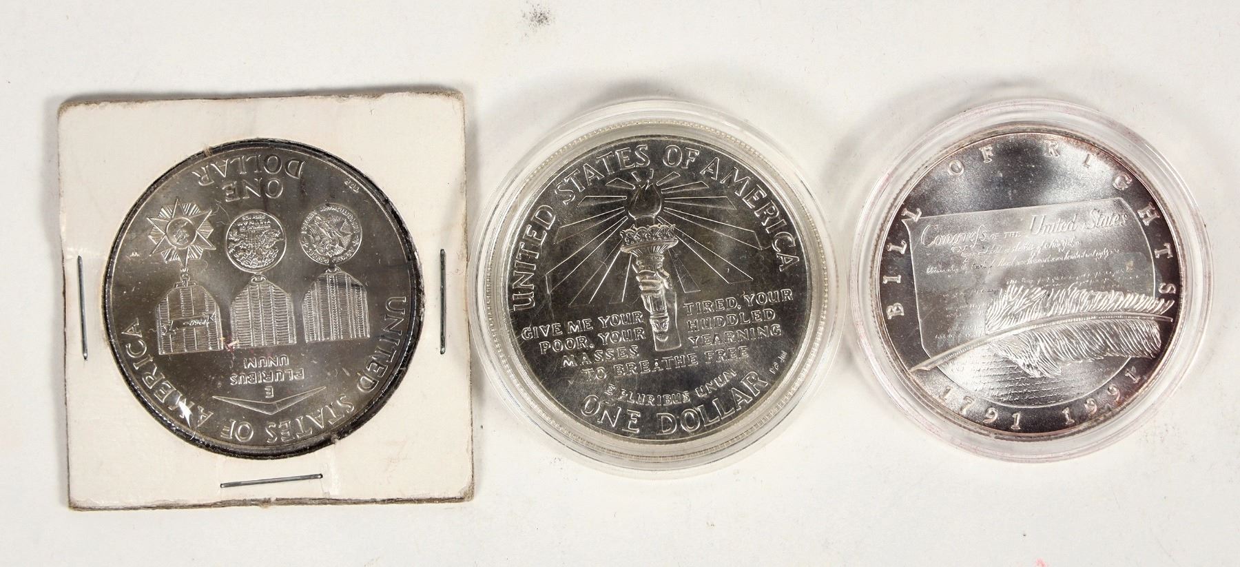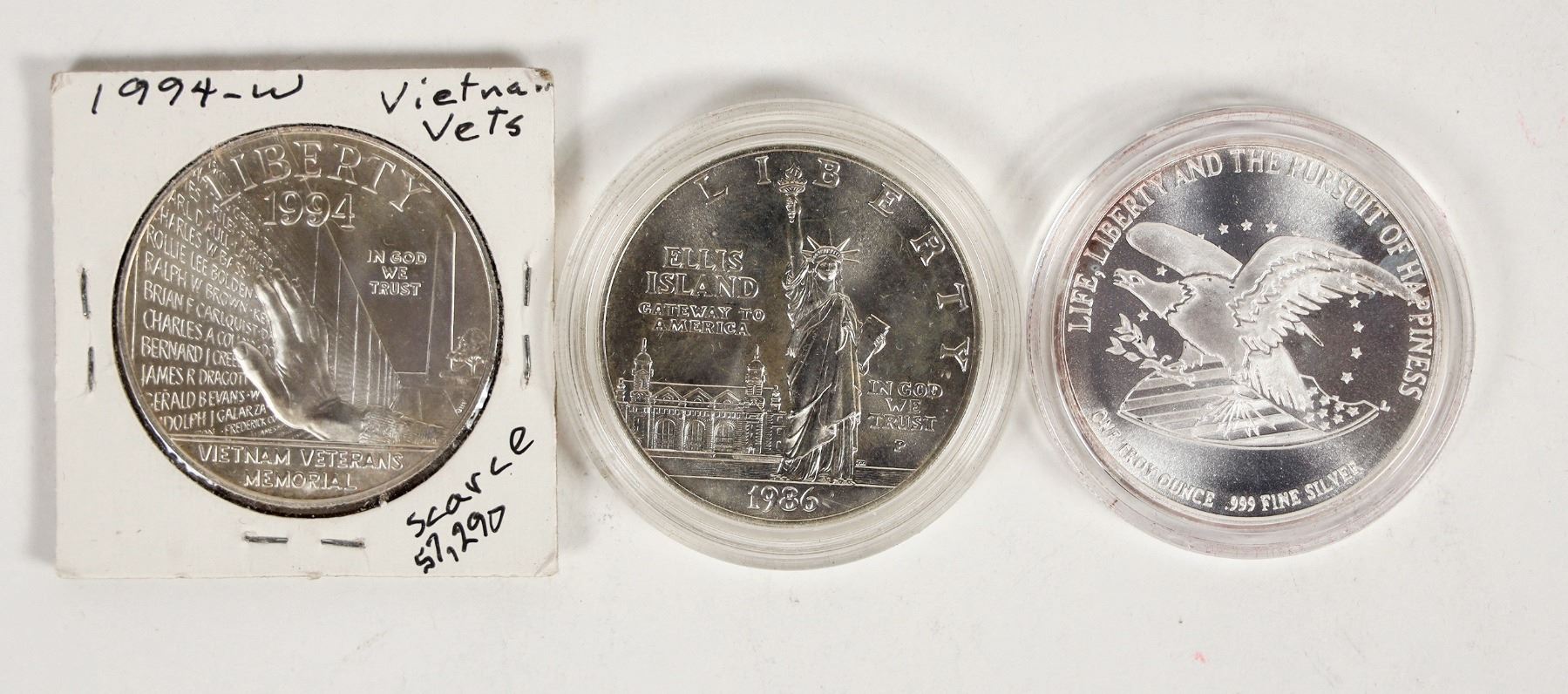Three silver commemoratives: 1991 Chrysler Corporation honoring The Bill of Rights, in original case with paperwork; 1986 Statue of Liberty silver dollar; 1994-W Vietnam Veterans Memorial silver dollar.