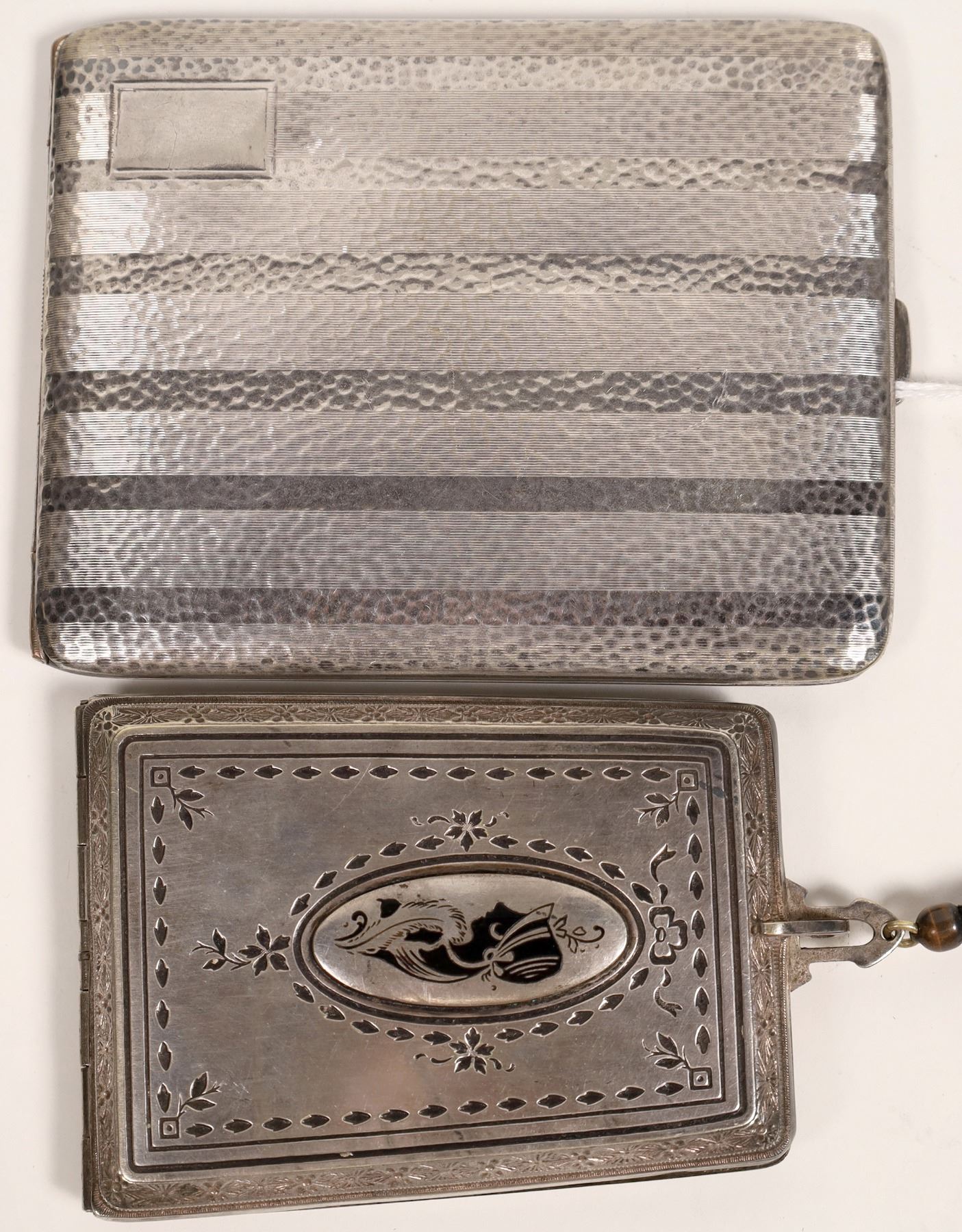 This is a lot of one nickel silver compact with engine turned finish interior, and a mirror. The exterior has a model from the flapper period in design. A monogrammed back. The second item is a silver cigarette case with hallmark in silver roughly 3 1/2 in. X 4 1/2 in. C 1920's-1930's.