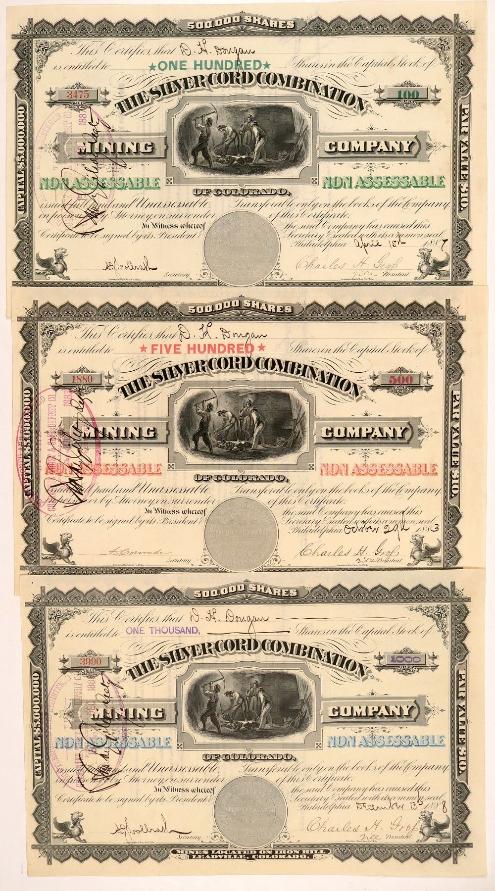 Lot of 3 different. This is a rare grouping! According to EMJ Vol. 52, in 1891 the mine, under the direction of Albert Blow, was working to construct a double-track tunnel from California Gulch (under Iron and Breece Hills) to drain the mines and make lower-grade more accessible and less expensive to process. Leadville's own Sutro Tunnel? This was first known as the Blow Tunnel, and later the Yak Tunnel. According to the 1883 CO Mining Directory, the company owned the Silver Wave and 7 other locations plus 60 acres of additional surface ground. These three stocks were issued in 1883, 1887, and 1888, all to DH Dougan. All three are signed by vice president Charles H. Grop and the secretary. None cancelled. Black border and print, underground mining vignette. Three different color varieties for the underprint (green, red, blue). "Mines located on Iron Hill, Leadville, Colorado" (printed at bottom center). Pinholes, folds, light wear. Ken Prag Collection