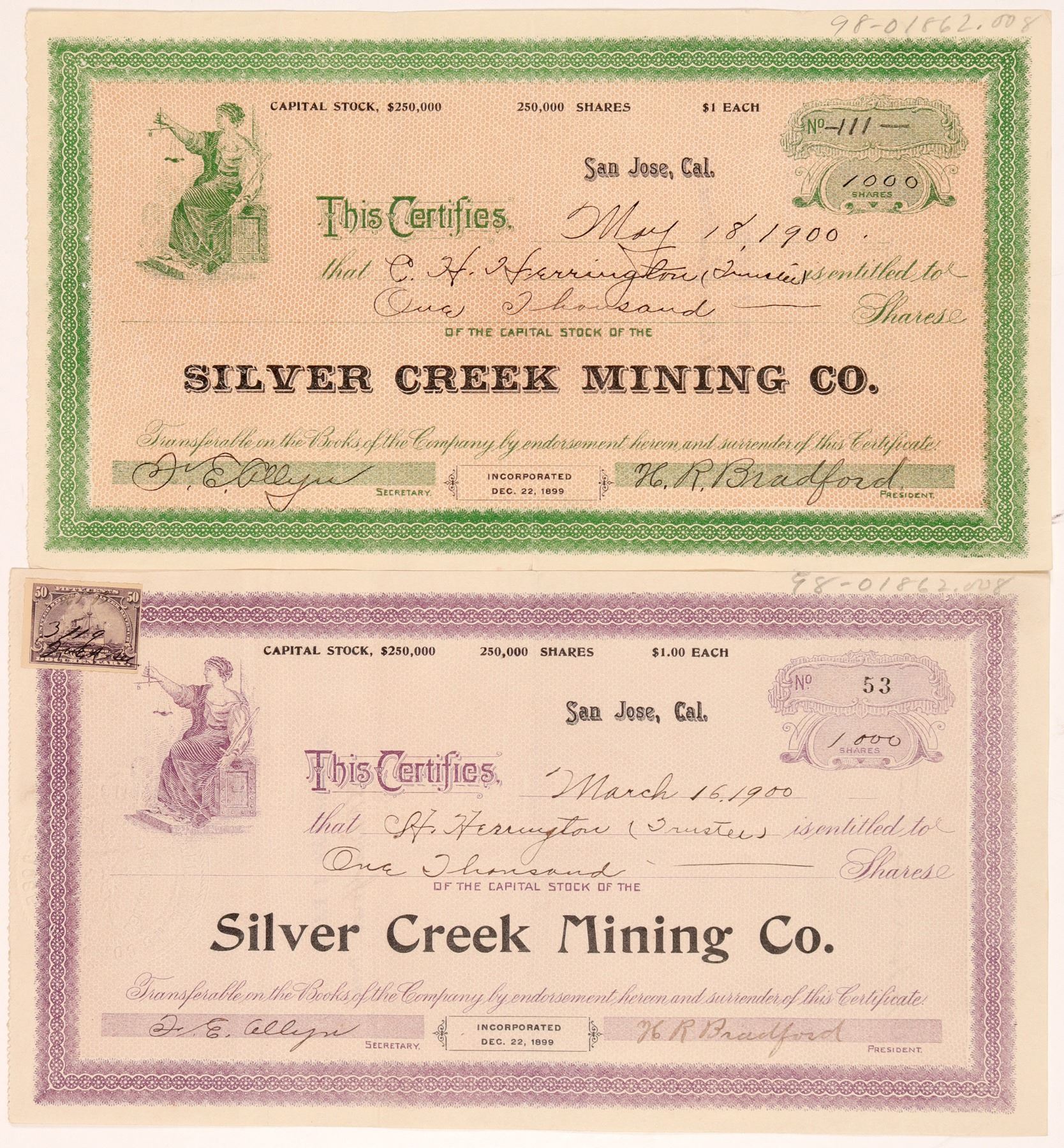 We have never heard of this company! Inc. Dec. 22, 1899. Two different. No. 53, issued for 1,000 shares to H. Herrington on March 16th, 1900 in San Jose. Signed by president HR Bradford and secretary Allyn. Not cancelled. Purple border and background, allegorical vignette of woman. Pinholes, folds. Also No. 111, issued to Herrington on May 18th, 1900 in San Jose. Sam corp signatures. Green border, same vignette.Pinholes, folds. According to the Los Angeles Herald (Jan. 3, 1900), the company "has entered actively into the development of an old quicksilver mine on Silver creek. Thirty years ago the mine was worked, and it is said that over $300,000 worth of quicksilver was taken out. With the fall in price the mine was abandoned. Tho present high prices have caused the organization of the new company and a renewal of work. A new smelter will be constructed." Ken Prag Collection