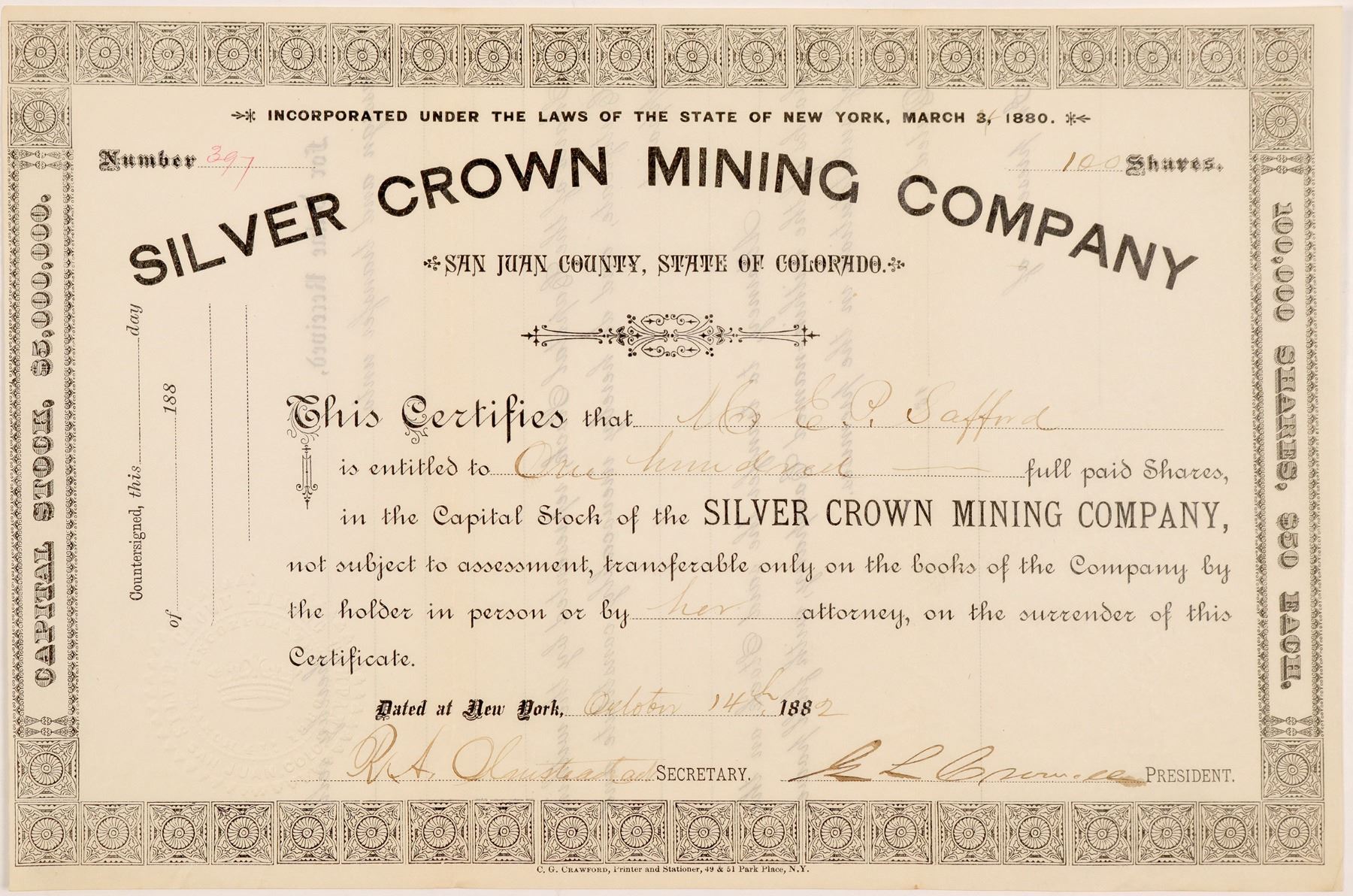 San Juan County, State of Colorado (printed below title). Inc. in New York, 1880. No. 397, issued for 100 shares to EP Safford on Oct. 14th, 1882 in New York. Signed by president Cromwell and the secretary (illegible). Not cancelled. Not cancelled. Ornate black border and black print, no vignette. Printed by CG Crawford, NY. Folds, clean. 6.75 x 10.25" Owned five claims (Silver Crown, Wonderful, and 3 others) in Mill Gulch, 1.75 miles west of Chattanooga, Red Mountain District. Pay streak is 30 inches, assaying 45% lead and 40 ounces of silver per ton. Developed by two tunnels and five open cuts. [Corregan & Lingane, 1883, pg. 671] Ken Prag Collection