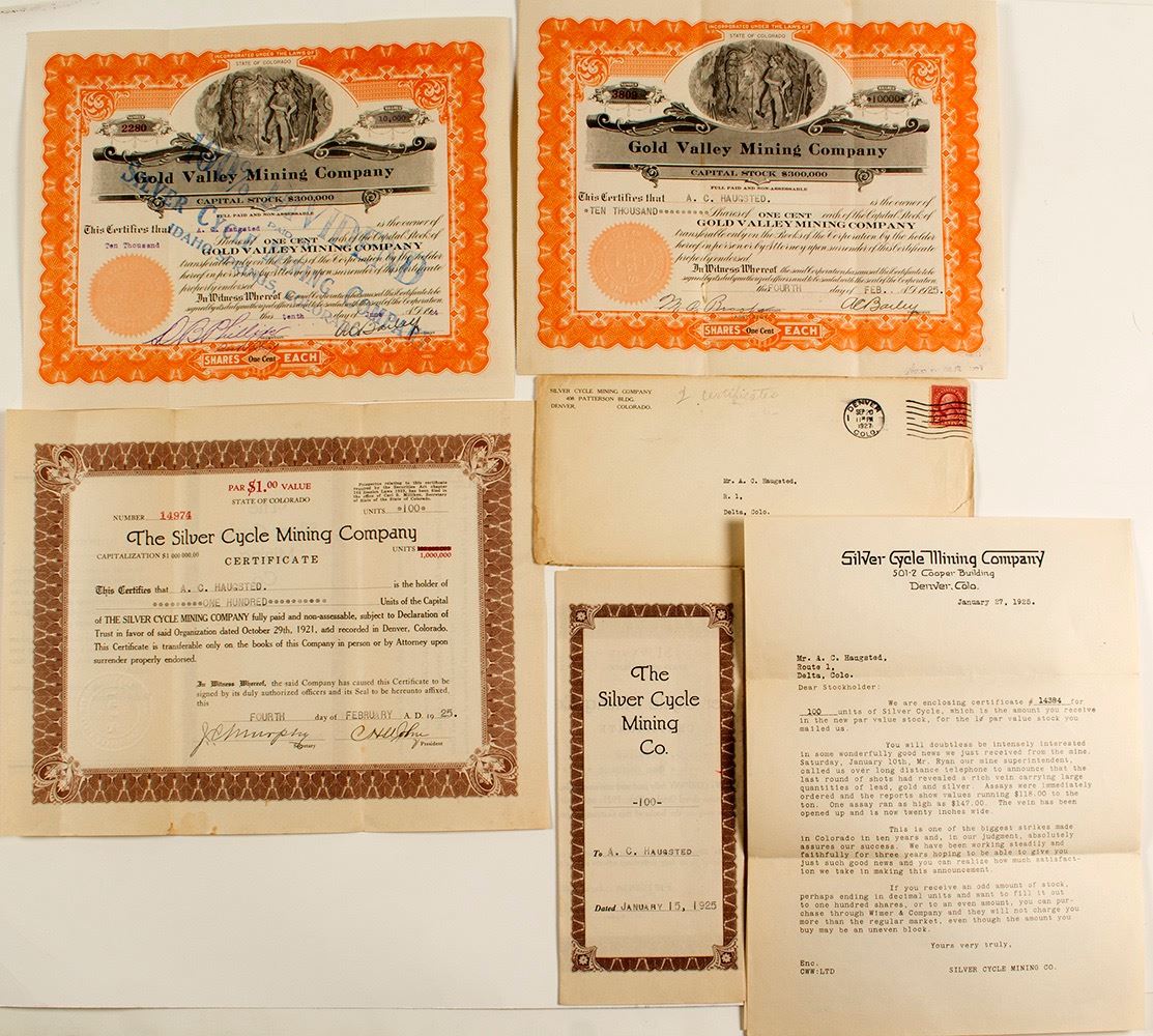 Lot of seven. 1-2) Two Silver Cycle Mining Company stocks (#'s 2280 and 3809). Issued in 1924 and 1925. One is stamp cancelled "100% Dividend, Silver Cycle Mining Company, Idaho Falls, Colorado." 3-4) Two stocks from the Gold Valley Mining Company. 1925. 5-7) Two letters (with one envelope) pertaining to the mines. 1925 letter telling the buyer "Mr. Ryan our mine superintendent called us over long distance telephone to announce that the lost round of shots had revealed a rich vein..." The second letter is 1927 and states, "...notified Silver Cycle stockholders that the company was a legitamate failure..." But take heart, the new Gold Medal Mining Company would fix all of that. There are 4 pages worth of how they will do that. Date: 1925 Location: Idaho Springs, Colorado HWAC # 45463