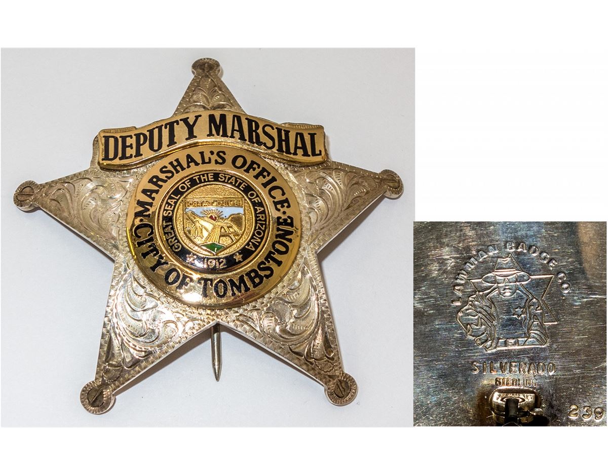 Five pointed silver badge made by the Lawman's Badge Co. Numbered 239. Says Deputy Marshal / Marshal's Office / City of Tombstone; Arizona state seal in the middle. Recent vintage. Sterling.