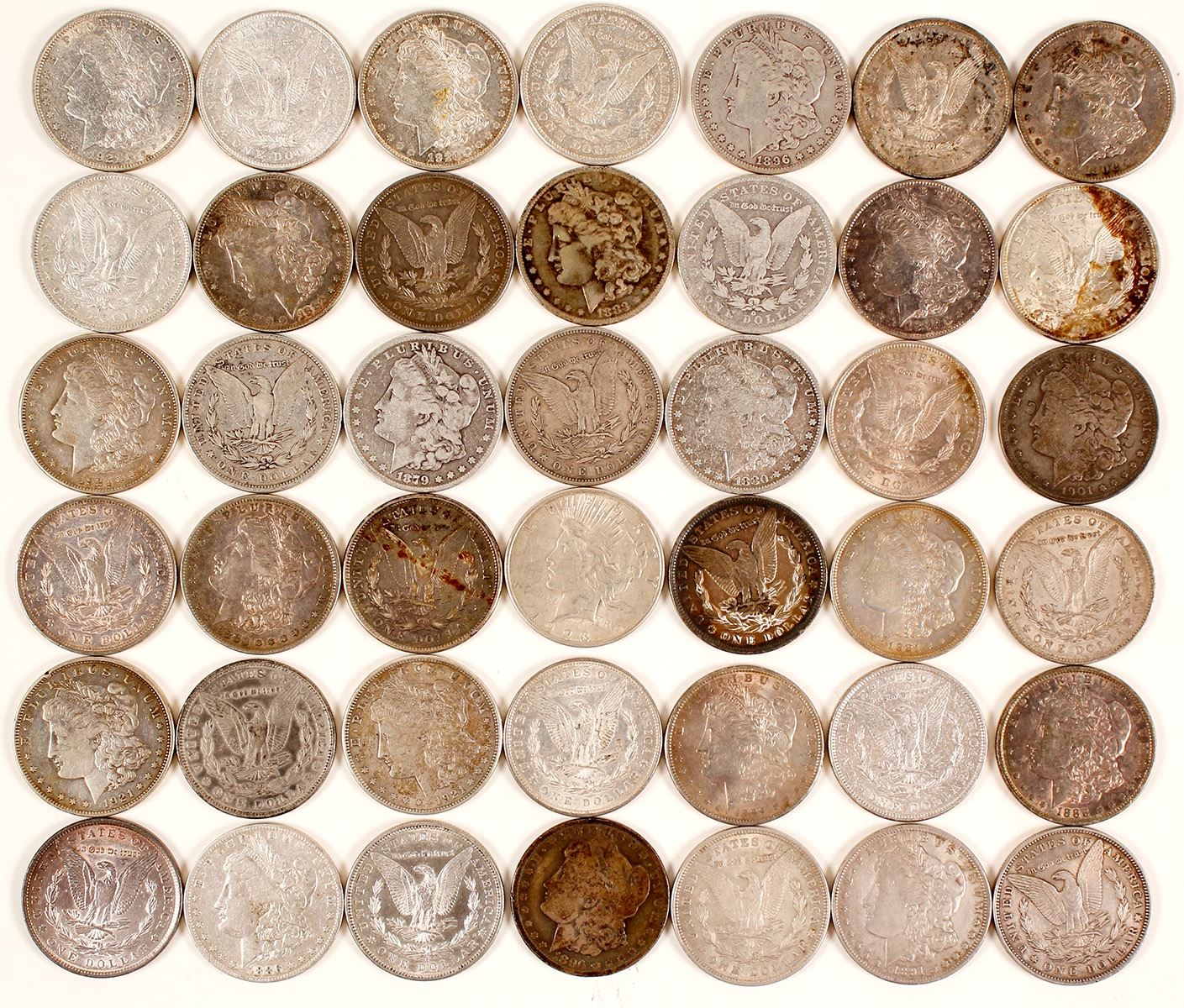 Lot of 42 silver dollars: One 1923 Peace dollar; 29 pre-1900 Morgan dollars; one counterstamped "H H M M"; 11 1921 Morgan dollars. Mostly extra fine condition, no culls here. Date: Location: HWAC# 71040