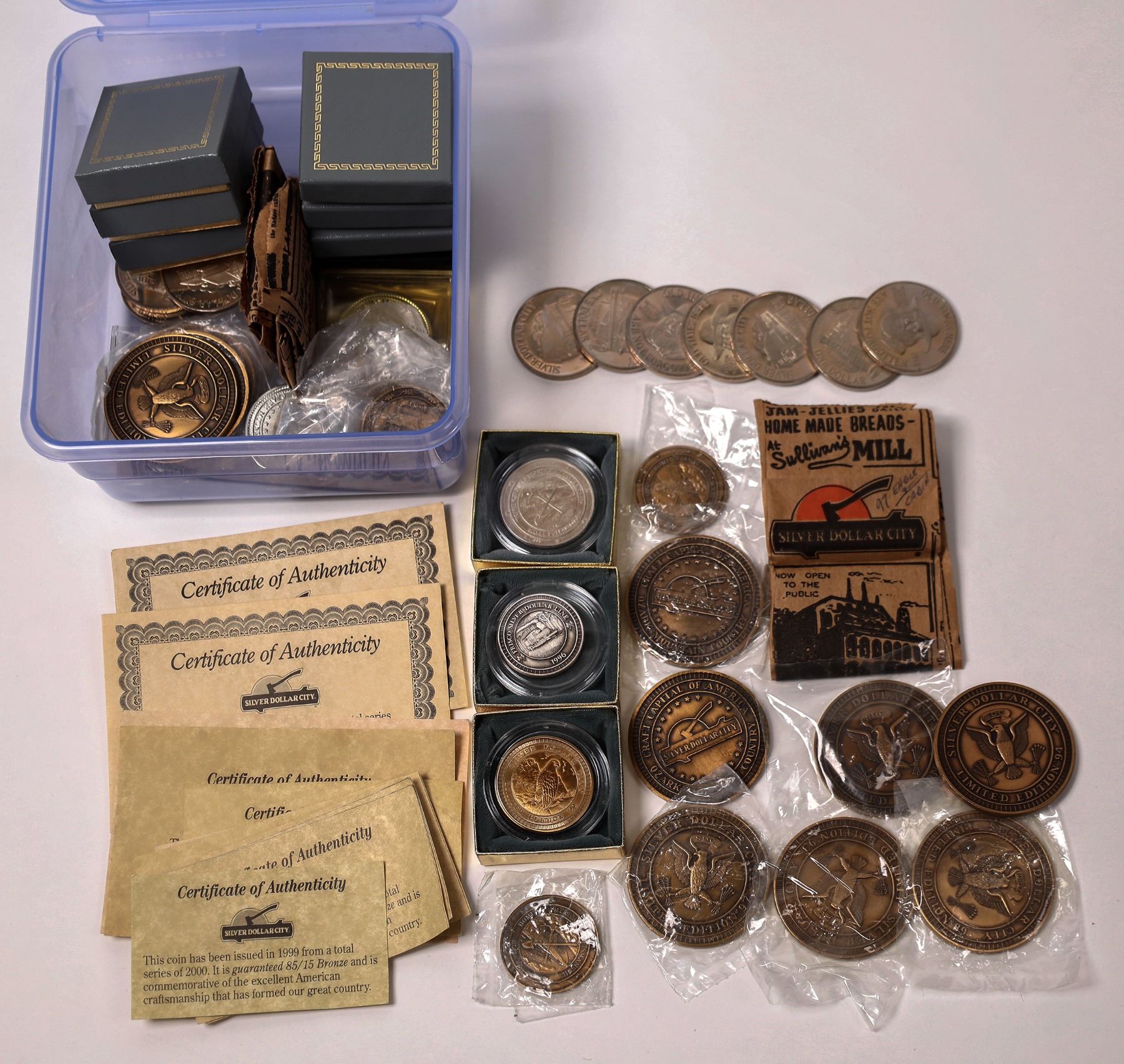 Silver Dollar City is an internationally awarded 1880s-style theme park located in Branson, Missouri. About eleven different medals, 57 total pieces, some silver. Bronze 2.1 diameter (11); white metal "old times" (12); 8 white metal 1.5"; 1999 silver one ounce (9); three sets of two white metal Silver Dollar City in brown box.