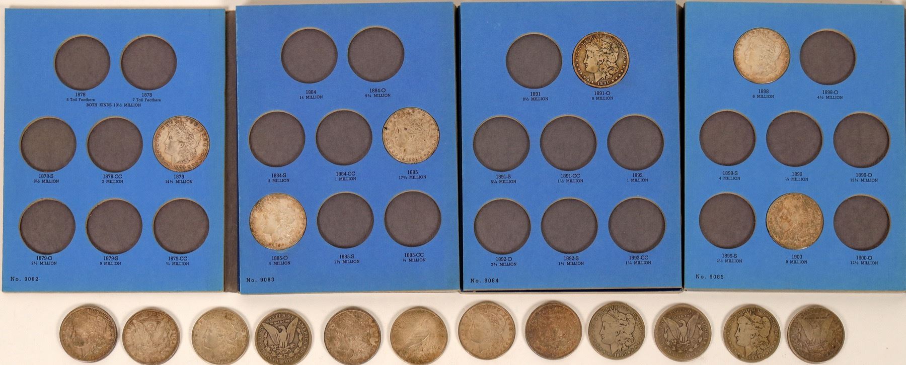 Four blue Whitman albums: 9082, 9083, 9084 and 9085. 22 Morgan dollars in the albums, 11 loose. 32 Morgan and one Peace dollar total, average circulated.