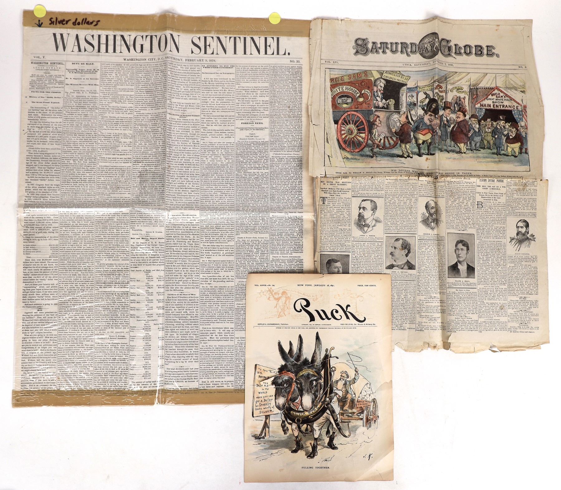 Three vintage newspapers with journalism about silver dollars: 1) Washington Sentinel; February 9, 1878: "History of Our Daddy Dollar" The article is just column one, but the whole four page broadside newspaper section is included, in excellent condition. 2) Puck; January 28, 1891: "Pulling Together," cover page cartoon of the donkey Congress pulling the Silver Ring's surplus production of silver to the U. S. Mint: the only place in the world where you can get a dollar for seventy cents worth of Silver. (The Sherman Silver Purchase Act of 1890 required the government to buy millions of ounce of silver above what was required by the 1878 Bland-Allison Act, driving up the price of silver and pleasing silver miners.) 3) Saturday Globe (Utica, NY); November 7, 1896: "His Dollar Was Big Enough But Short in Value." Seven column wide above the fold color cartoon depicting Uncle Sam's circus over William Jennings Bryan's campaign for free silver. Ragged edges, tears along the center fold.