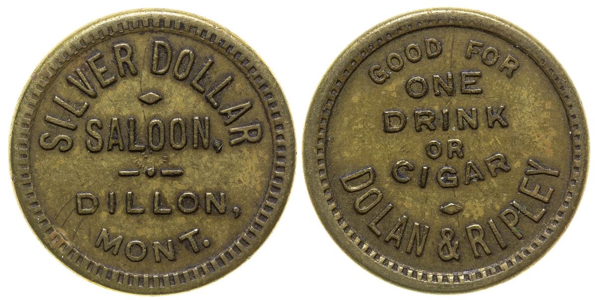 R-8. Silver Dollar / Saloon / Dillon / Mont. // GF / One / Drink / Or / Cigar / Dolan & Ripley. Round, brass, 21mm. City: Dillon State: Montana, Date: Inventory# 38842
