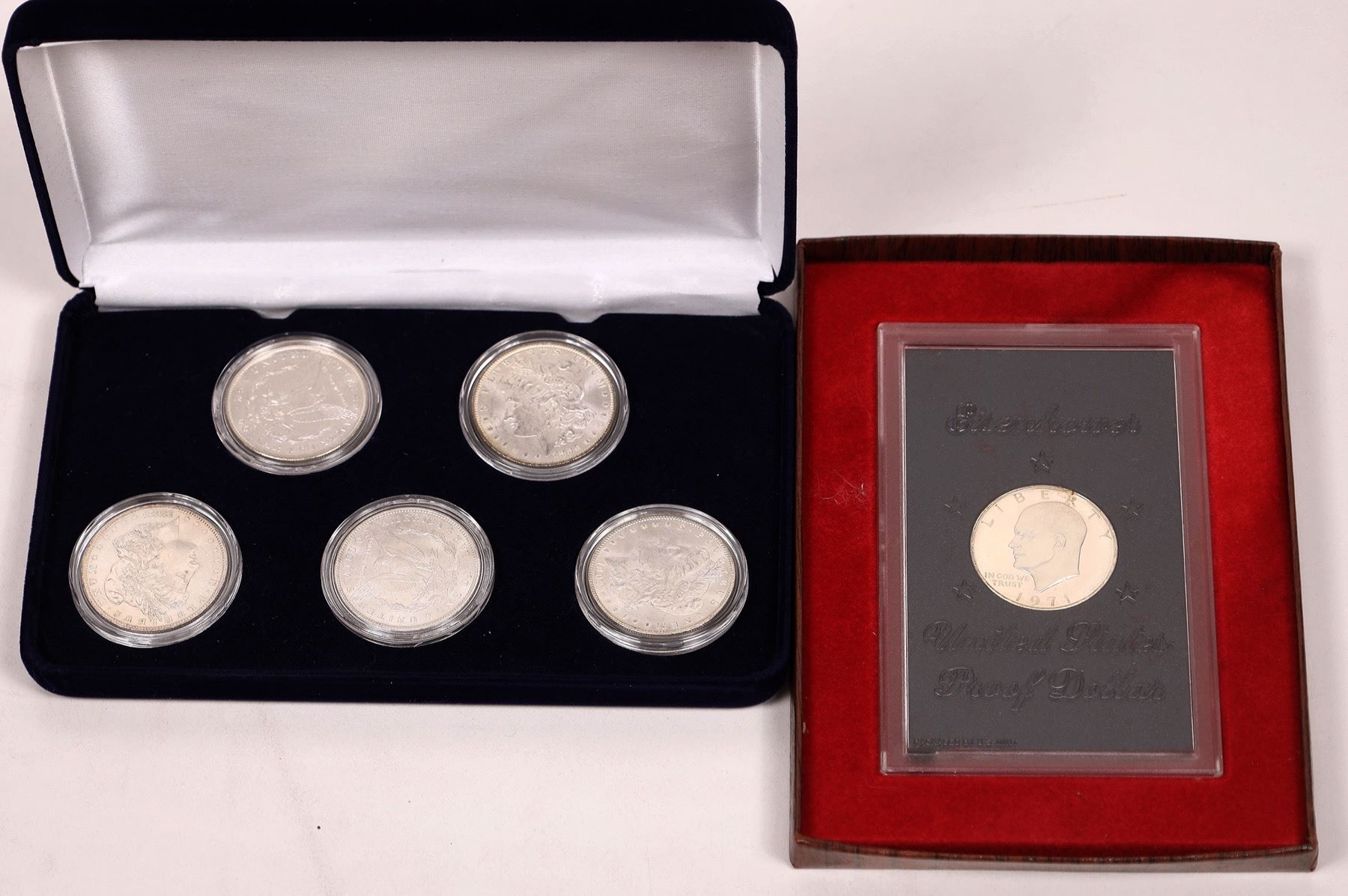 Blue velvet box containing five uncirculated Morgan dollars in plastic cases: 1881-S; 1883-O;1885-O; 1896; 1902-O. Also a United States Proof Eisenhower Dollar, 1971-S silver clad in original brown box. City: State: Date: