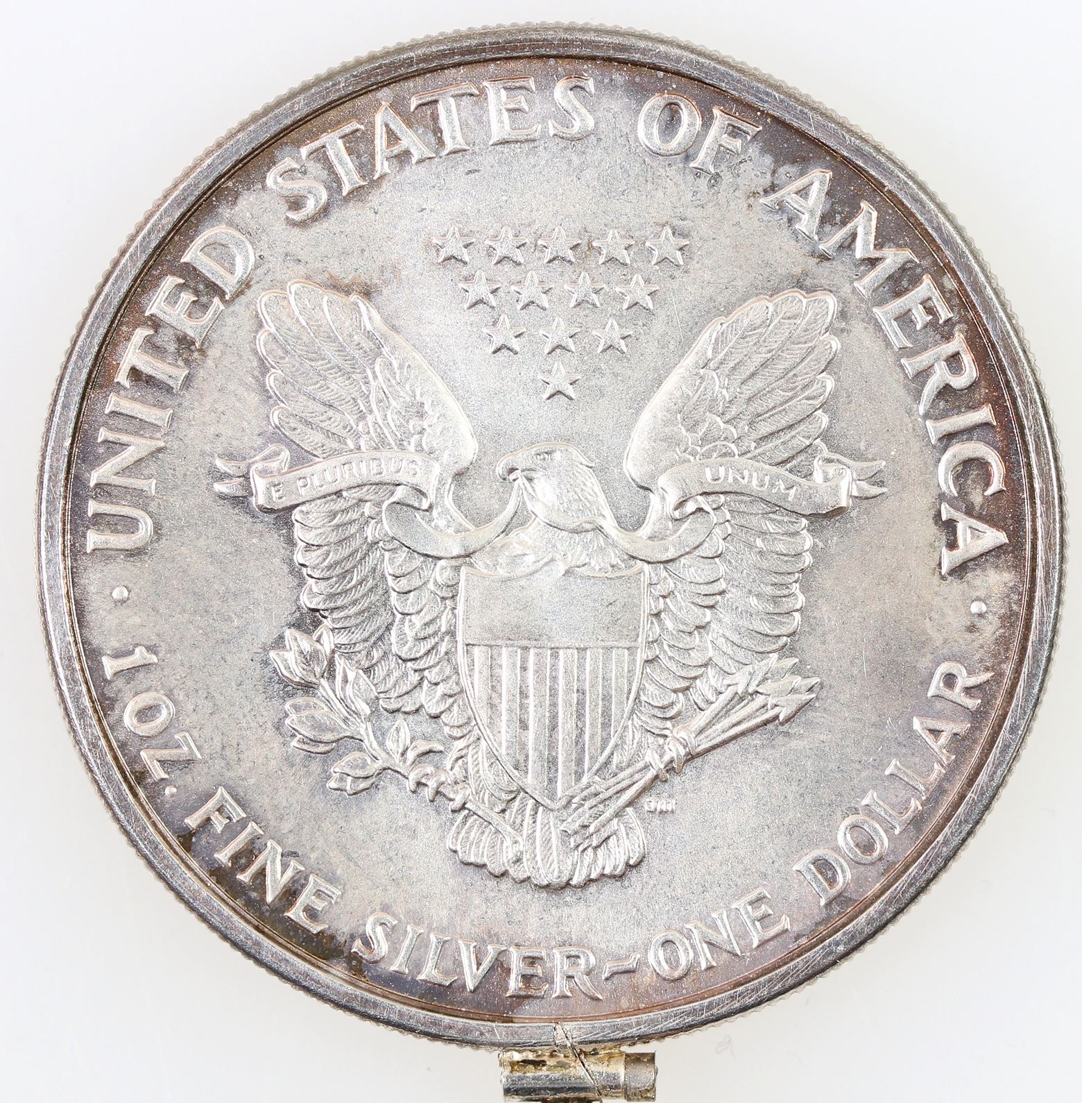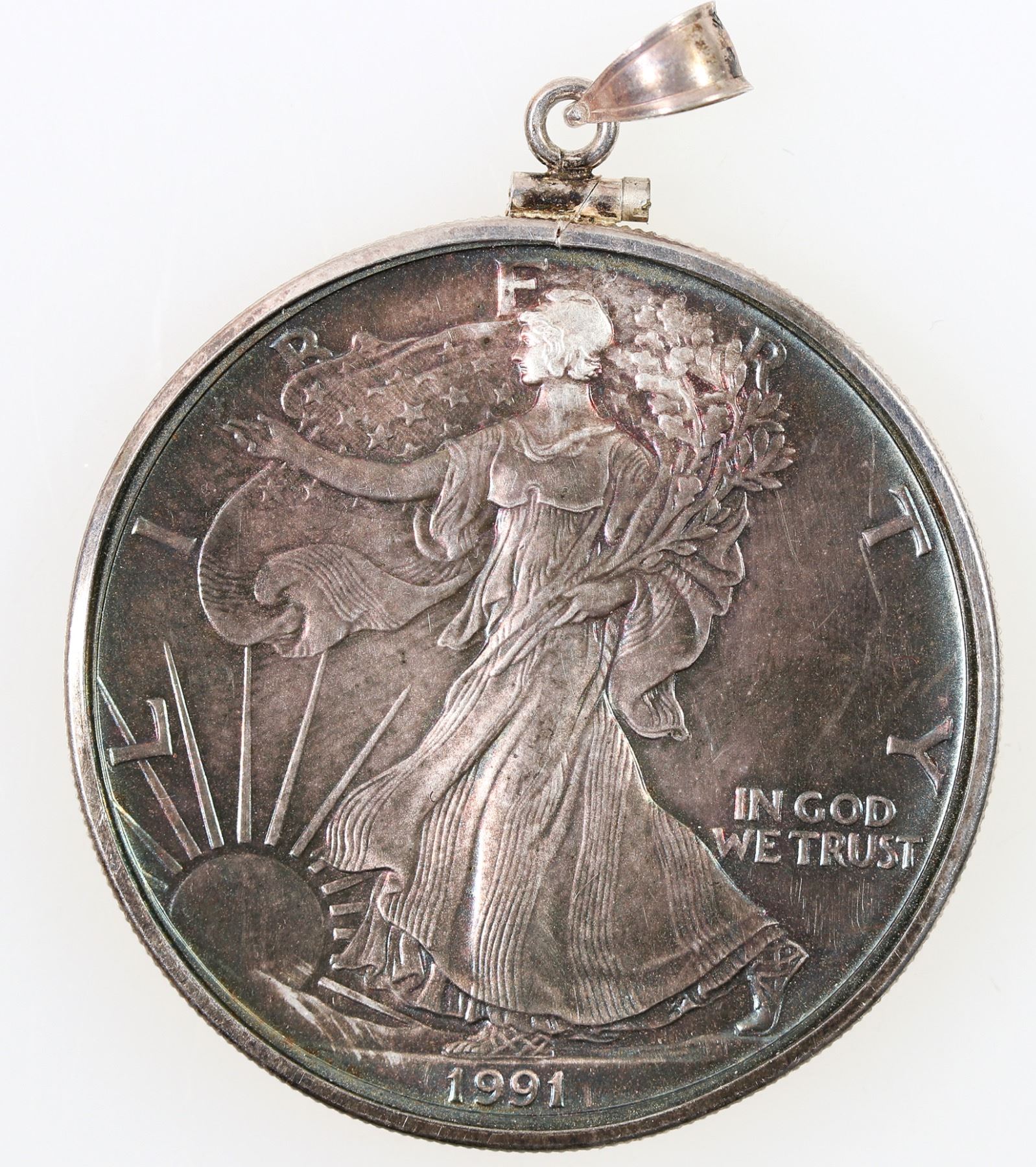 Toned 1991 one ounce silver American Eagle dollar, with reeded bezel. [