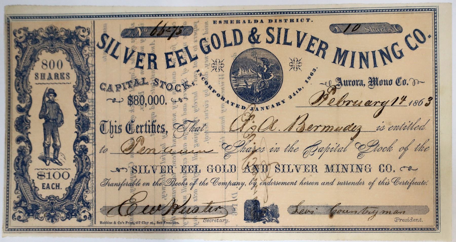 Numbers 66 to 75. Ten shares to A. A. Bermadez. Signed by secretary E. Kuster and president Levi Countryman. RARE Aurora, Mono Co. dateline. February 14, 1863. Incorporated January 24, 1863. Not cancelled. Miner with pick vignette and California seal vignette. Robbins & Co. printer. Blue on off white. Cut roughly on bottom. No other edge, corner, pin hole of discoloration issues. The Silver Eel was being traded on the Sacramento Stock and Exchange Board in 1863. Secretary Kuster was the successor to assayer Harvey Harris in Aurora. Includes short biography on Kuster.