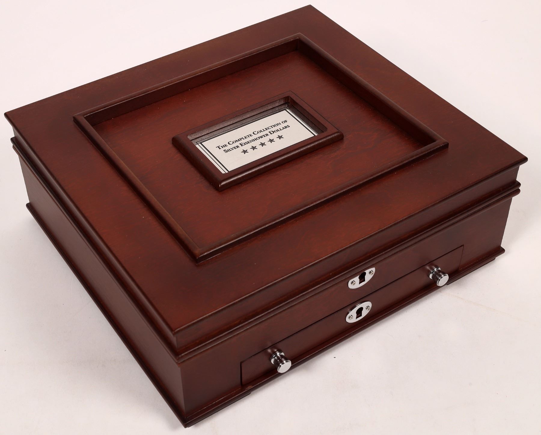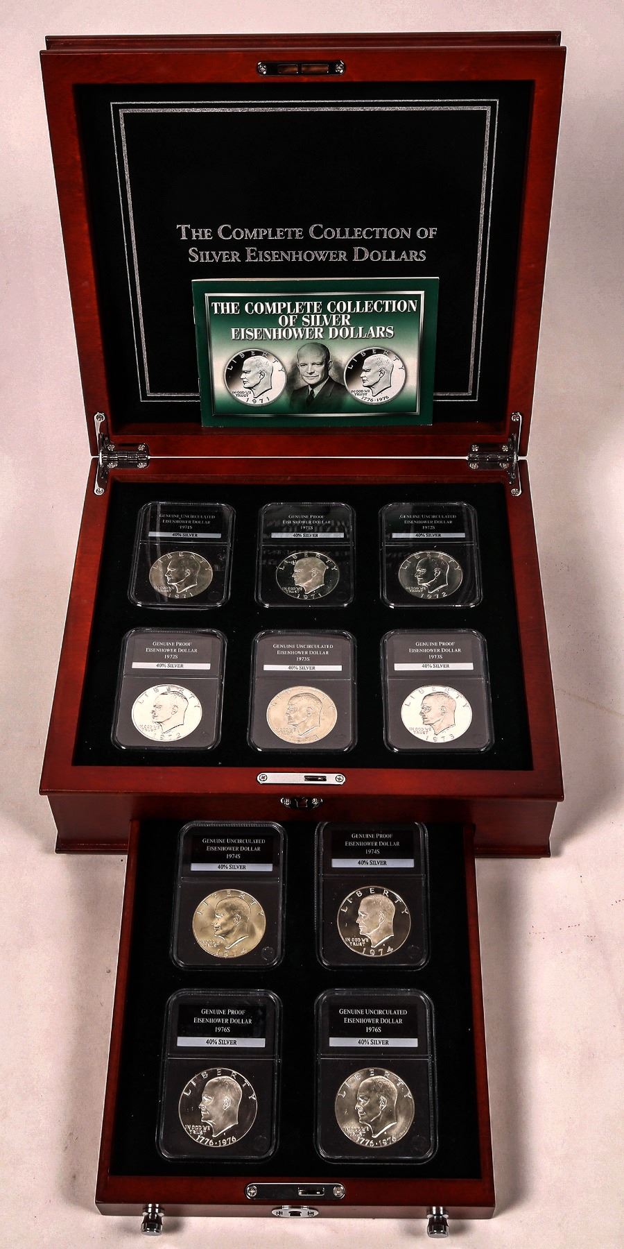 Issued by PCS Stamps and Coins: The Complete Collection of Silver Eisenhower Dollars. Ten uncirculated and proof 40% silver Eisenhower dollars from 1971-1976. The elegant wooden chest (measuring 10.5" x 9.6" x 3.5") and expertly written booklet, which includes fascinating details about your coins and the distinguished man they honor, is included.