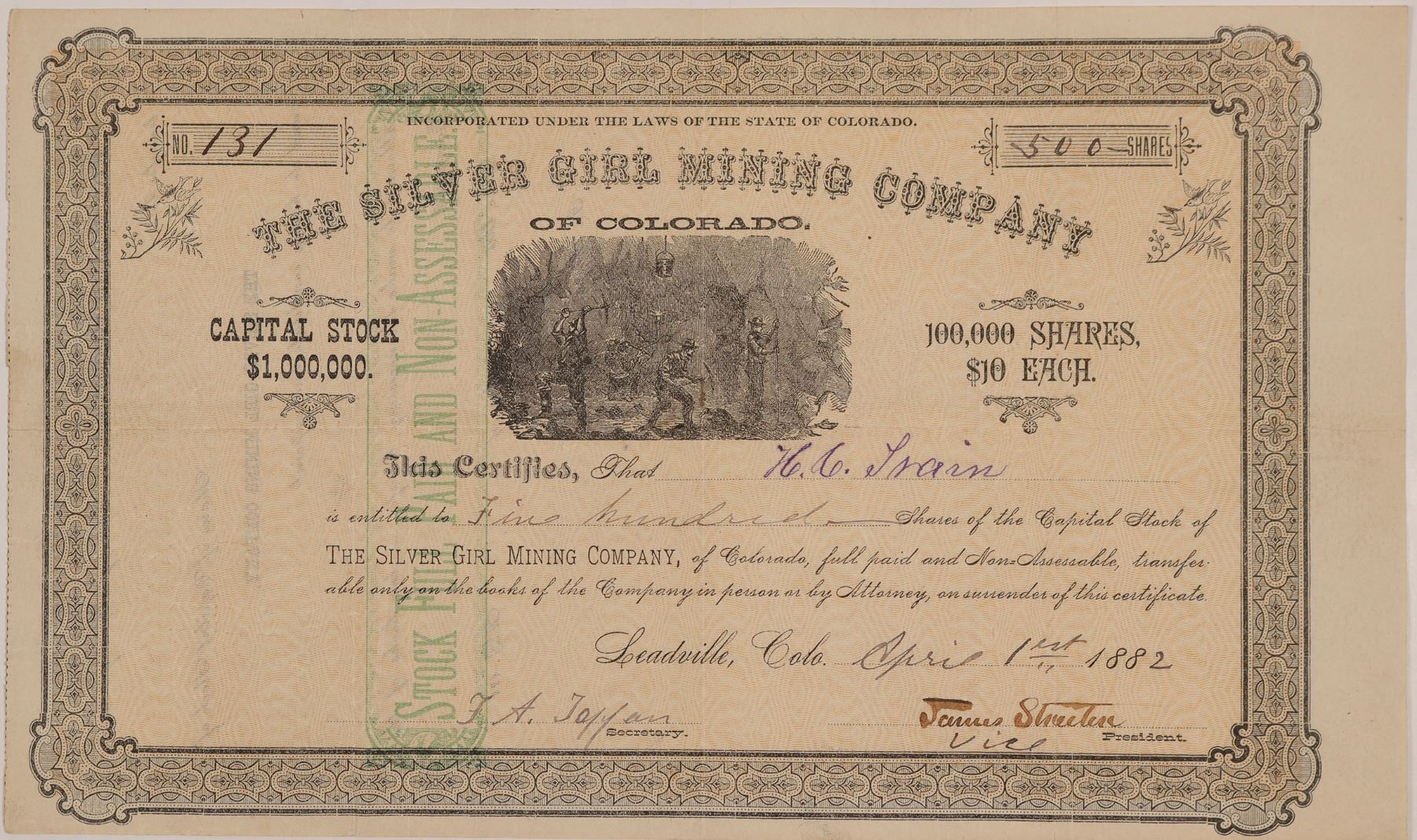 Unique name for a mining company! Inc. in Colorado. No. 131, issued for 500 shares to H.C. Swain on April 1st, 1882 in Leadville. Signed by vice president James Streeter and secretary FA Tappan. Stamped "Stock Full Paid and Non-Assessable." Black border and print, tan background, and mining vignette. No printer listed. 6.5 x 11" Deep folds, creases, some toning. Not listed in C&L. According to a March 4th, 1881 Leadville Democrat article, the company was incorporated to mine in Lake, Park, and Summit Counties. No other information found. Ken Prag Collection