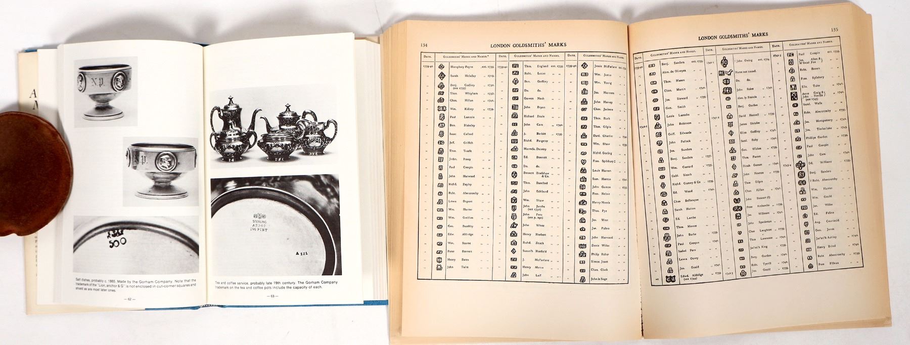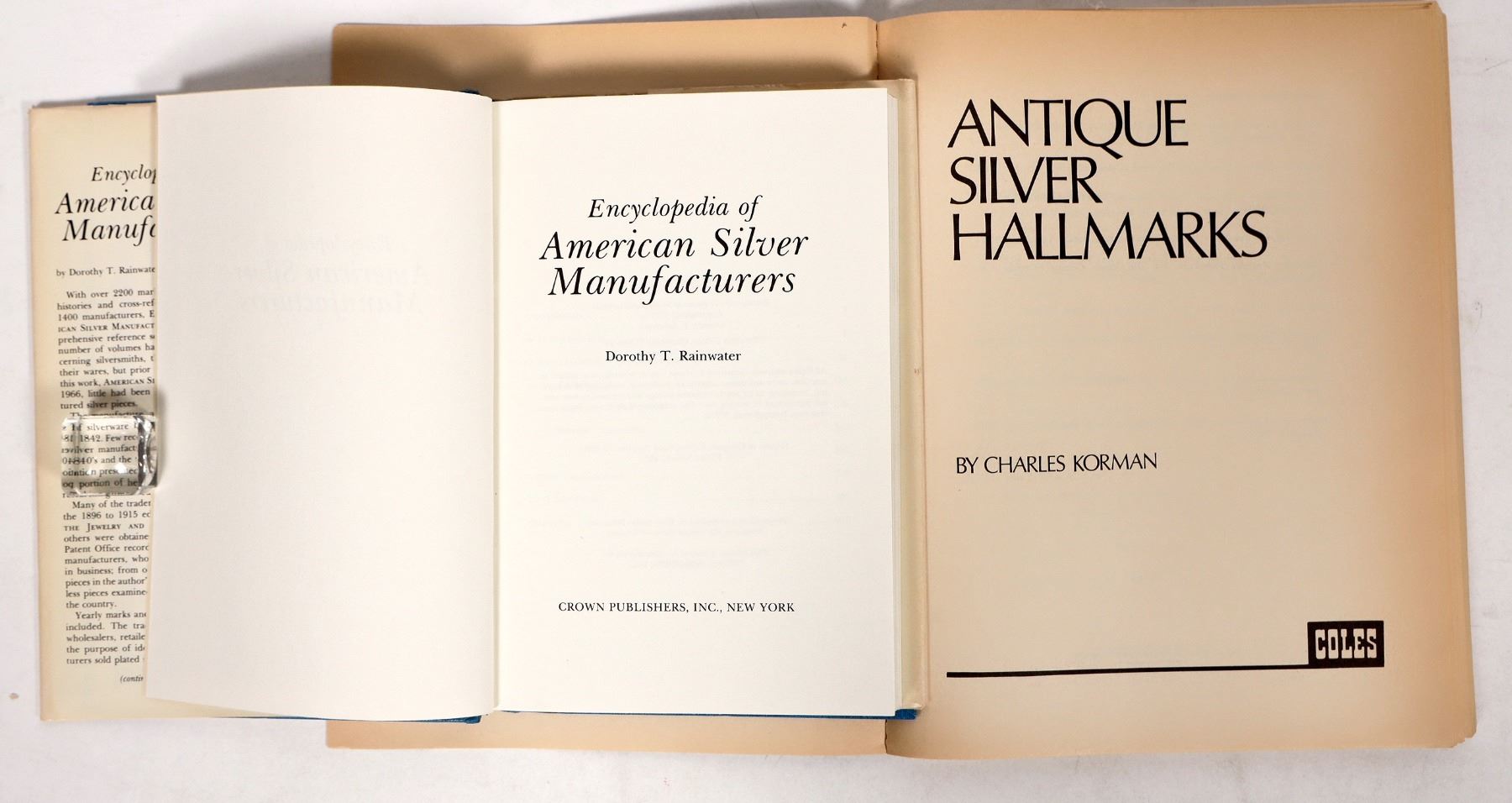 A pair of books about silver hallmarks, including: "Encyclopedia of American Silver Manufacturers," Dorothy T. Rainwater, "A history of more than 1400 manufacturers, over 2200 marks illustrated, "Crown Publishers, 1978, hardback, dust jacket, 222 pp., very good; and "Antique Silver Hallmarks," Charles Korman, Coles Publishing Co., 1978, paperback, 248 pp., foxing, otherwise good.