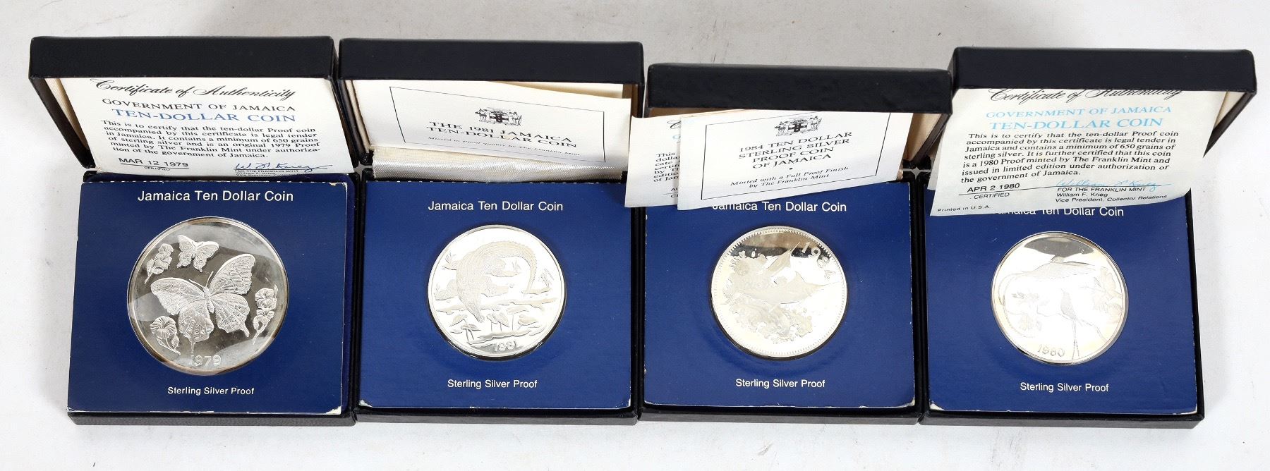 In original cases from the Franklin Mint: four proof $10 sterling silver coins: 1979, 1980, 1981, 1984. Silver (.925); 22.45 grams; 39 mm.