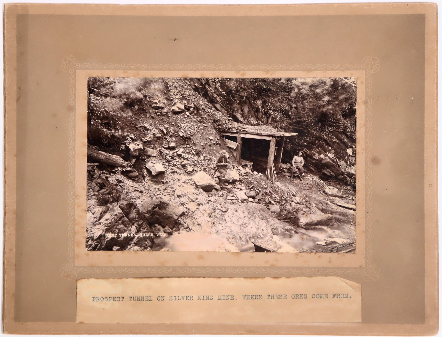 Silver King Mining Company, Elkhorn, Oregon, Photograph and Prospectus. Nice pairing. The photograph is 4 X 6 inches mounted on a decorative card and entitled below: "Prospect Tunnel on the Silver King Mine, Where these ores come from." Imprinted in white small print on the photo is, "East Tunnel Queen Vein." The same photo is printed in the prospectus on p. 9 and titled, "East Prospect Tunnel on Queen Vein, showing ore formation, width from hanging wall to foot wall about 130 feet." The prospectus booklet measures 5 x 7 inches, 32 pages with violet stock wraps and silver print identifying the mine, location and an office located in Portland. The company is capitalized at $500,000; at $1 per share. The President is J. J. Langmark of Portland. The Silver King Mine is located in the Lester Mining District on the western slope of the Cascade Range, 24 miles northwesterly from the summit of Mt. Jefferson. The mine consists of 12 mining claims lying contiguous with an aggregate of 240 acres. Another prospect tunnel west is some 300 feet from the East Tunnel and is pictured in the prospectus. There are numerous assay reports that show both gold and silver running at some $20 to as high as $145 per ton. Elkhorn Oregon