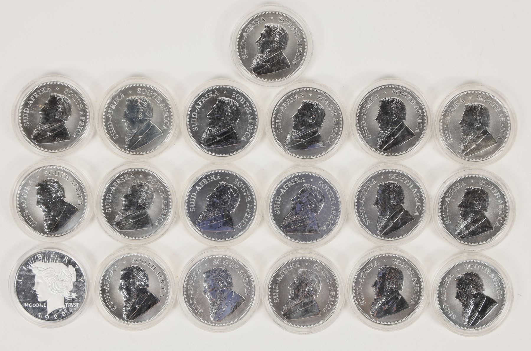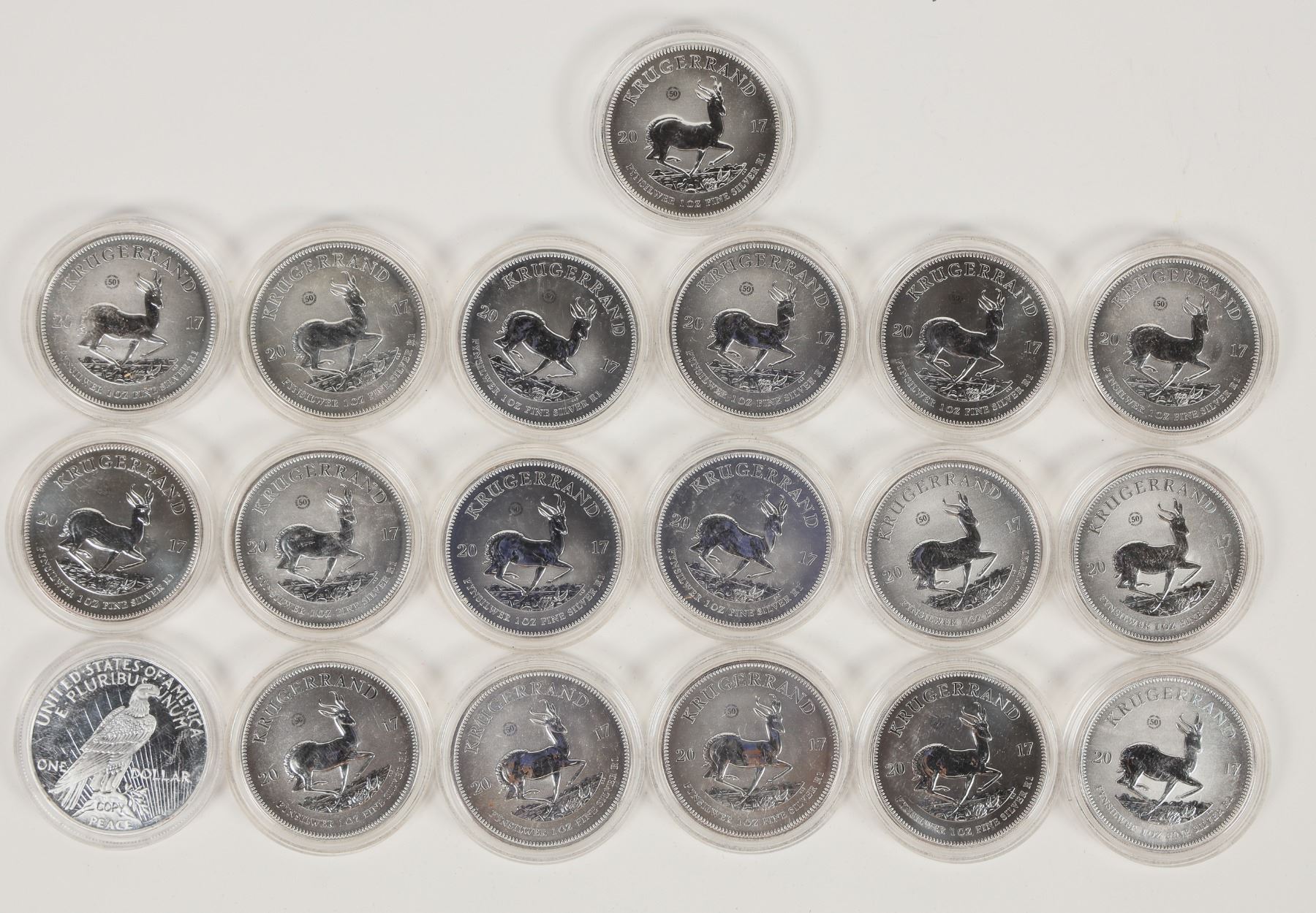 Eighteen silver one ounce 2017 Krugerrands, minted by the Republic of South Africa. One 1922 Peace dollar "COPY" not marked silver. All in hard plastic cases.