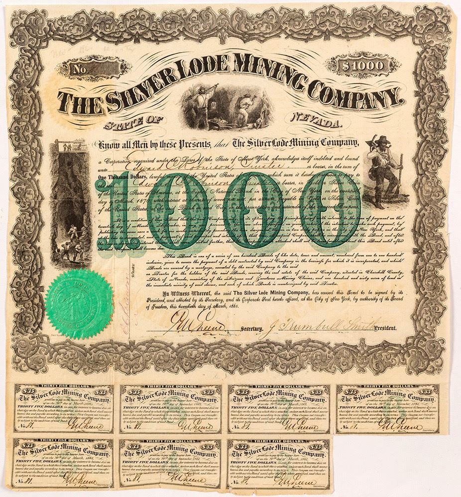 We don't see many bonds for Nevada mining companies! This is certificate 61 issued to Edward Robinson, Trustee. Robinson would be the company secretary in 1866. Incorporated in New York. $1,000 bond. Includes original company seal. Signed by president J. Trumbull Smith and secretary Greene(?). The central vignette features two men in underground mining scene. Other vignette of three men underground, with two men lowering and raising ore buckets at left, and small vignette of miner leaning on pick in lower right. Black border. Mayer & Co., printers. The most active district in Churchill at the time was La Plata, with a population of 150, which also served as the county set from 1864-1868. This successful camp attracted enough capital to build a $125,000 mill by the Silver Wave Co., but lacked sufficient ore to make money. Another company is cited as having erected another mine and mill at Averill at the same time, suspected to be this company. US certificate stamp at right. 14.5 x 13" with remaining seven coupons. (Al Adams Gold Rush Memorabilia Collection) Date: 1865 Location: La Plata, Nevada HWAC# 55034