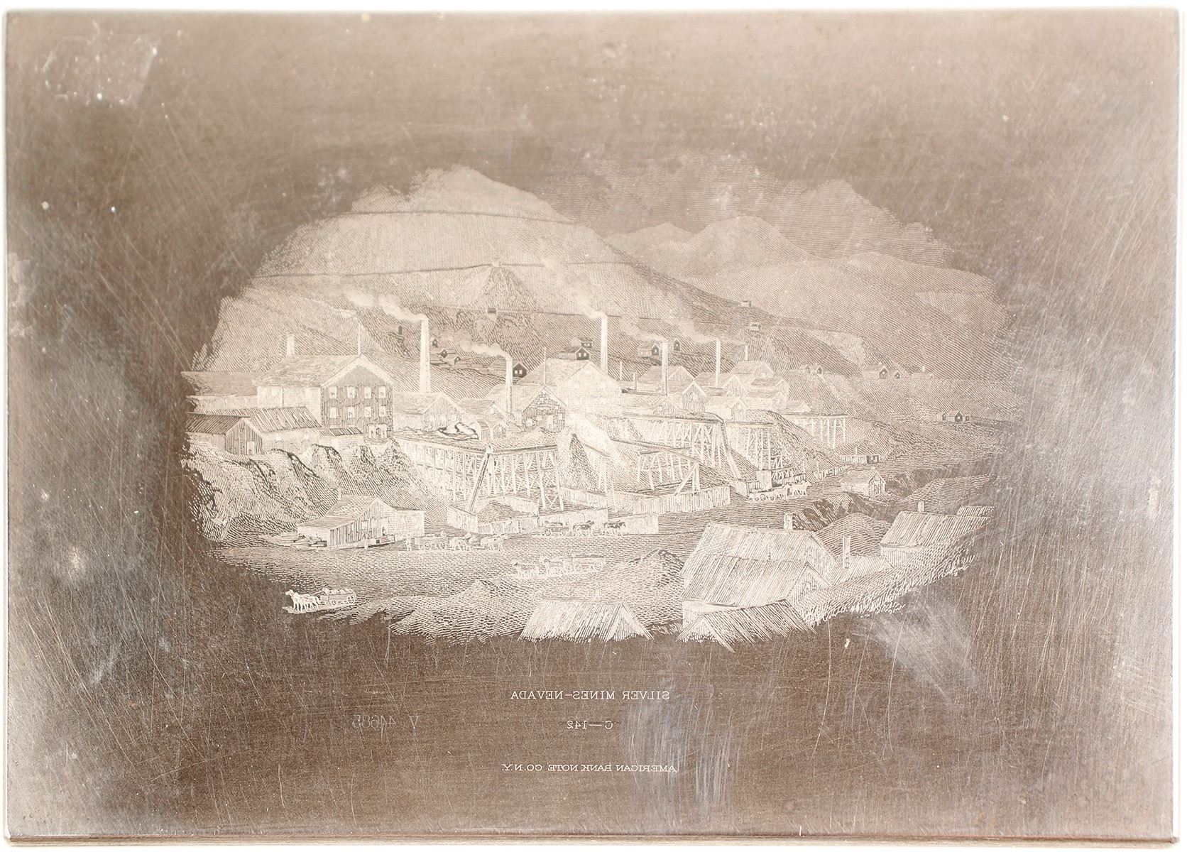 Original engraved printers plate with vignette of "Silver Mines - Nevada". Used for stock certificates, the plate is 5 3/8 x 3 1/4 inches and has a scene with ore wagons and stamp mills in operation under the mountains of Nevada. Original envelope included. American Bank Note inventory number V44685. Ex: Stack's February 2008 Rich Uhrich Collection auction, lot 4155. Date: Location: Nevada HWAC# 63620