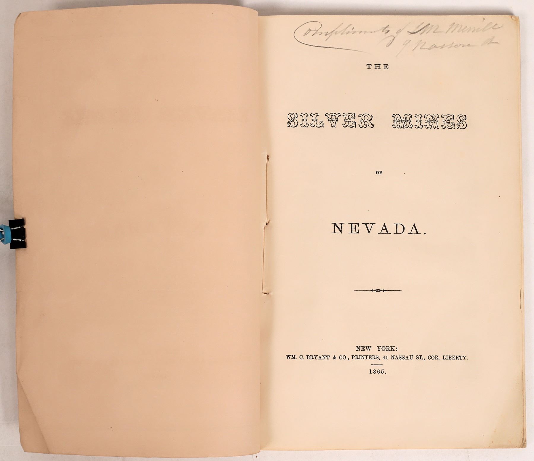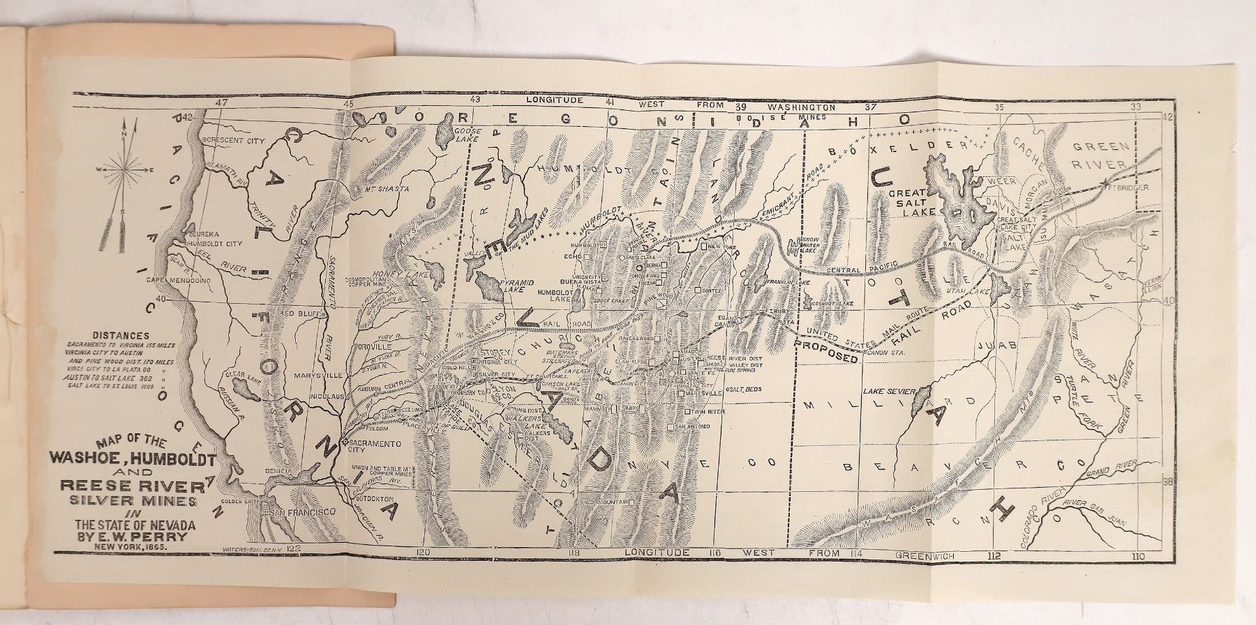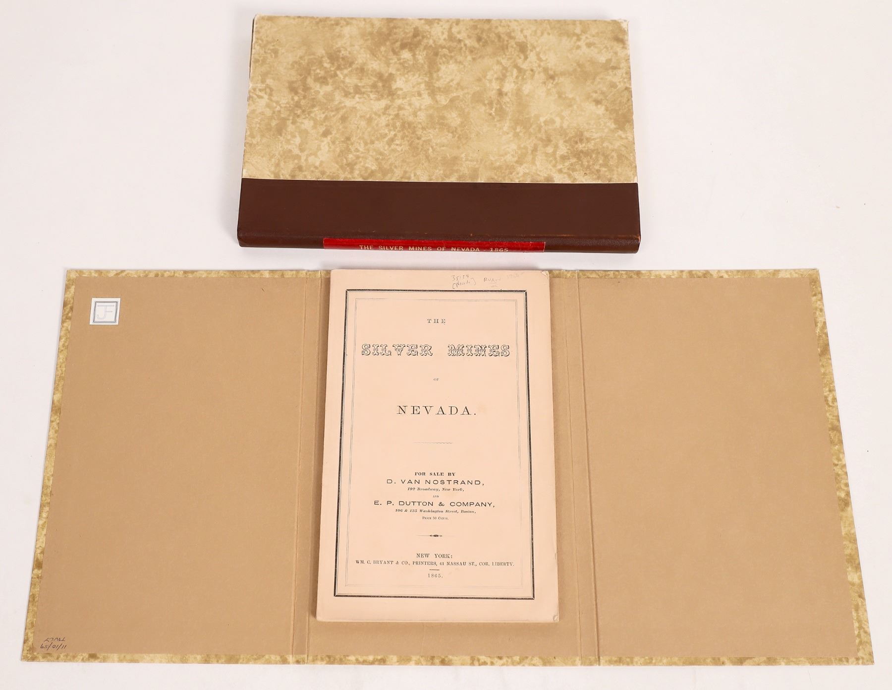 The Silver Mines of Nevada-1865, Wm. C Bryant & Co. 1865, 77pp. plus folding map. Original printed wrappers. In chemise and half morocco slipcase with spine gilt. The Bookplate of collector John J. Ford, Jr. on inside cover of slip case. Rare early pamphlet on Nevada Mining. Describes new diggings, towns, mines, settlements with many extracts from local newspapers. Map by EW Perry shows Washoe, Humboldt and Reese River silver mines. The publication of this rare pamphlet/booklet coincides with the push for investment in Reese River Mines in Central Nevada by New York money. The first ten pages discusses the California mines and the great Comstock Lode. It then moves slowly into discussion of the Reese River discoveries, with citation after citation from the Reese River Reveille. According to Eberstadt: "A comprehensive account of all that could be ascertained at that time regarding the new diggings, containing descriptions of the towns, mines, and settlements, together with many pages of extracts from the local newspapers. A scarce compilation of western newspaper accounts of silver mining in Nevada. Among the sources used are newspapers in Nevada and California, and the report of Interior Secretary J.P. Usher to the Congress on the mineral resources of the intermontane region is also included. Almost half of the volume devoted to the Reese River district with much of the rest split between Austin and the Comstock districts. The map, by E.W. Perry, shows the region of the Washoe, Humboldt, and Reese River silver mines in Nevada. The topography of the map is somewhat confused, but it ably shows the locations of several Nevada mines, especially those around Austin. Wheat notes that the same map also illustrates a promotional pamphlet for the Mountain Queen Silver Mining Company, which was also issued in 1865." WAGNER-CAMP 422c. HOWES N-61. PAHER, NEVADA, AN ANNOTATED BIBLIOGRAPHY, 229. EBERSTADT 107:293; 107:404. WHEAT TRANSMISSISSIPPI 1128.