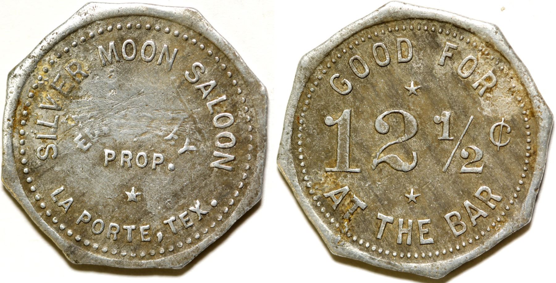 Obv.: Silver Moon Saloon / (obliterated name) / Prop. / La Porte, Tex.; Rev.: Good For / 12 1/2c / At The Bar. Wm, octagonal, 24 mm. Rare token. State: Texas City: La Porte Date: HWAC# 81463