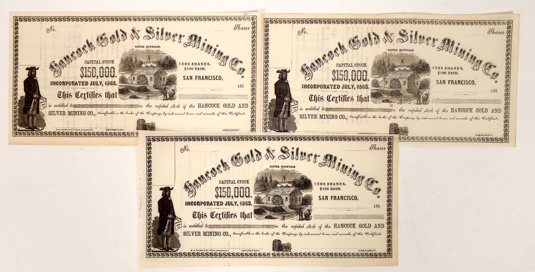A group of 3 unissued stock certificates from the Hancock Gold & Silver Mining Company, dating from the 1860s. The Hancock company operated at Silver Mountain, a mining town in Alpine County which has since been abandoned. The certificates have vignettes of a water wheel and an engraved border. Excellent condition.