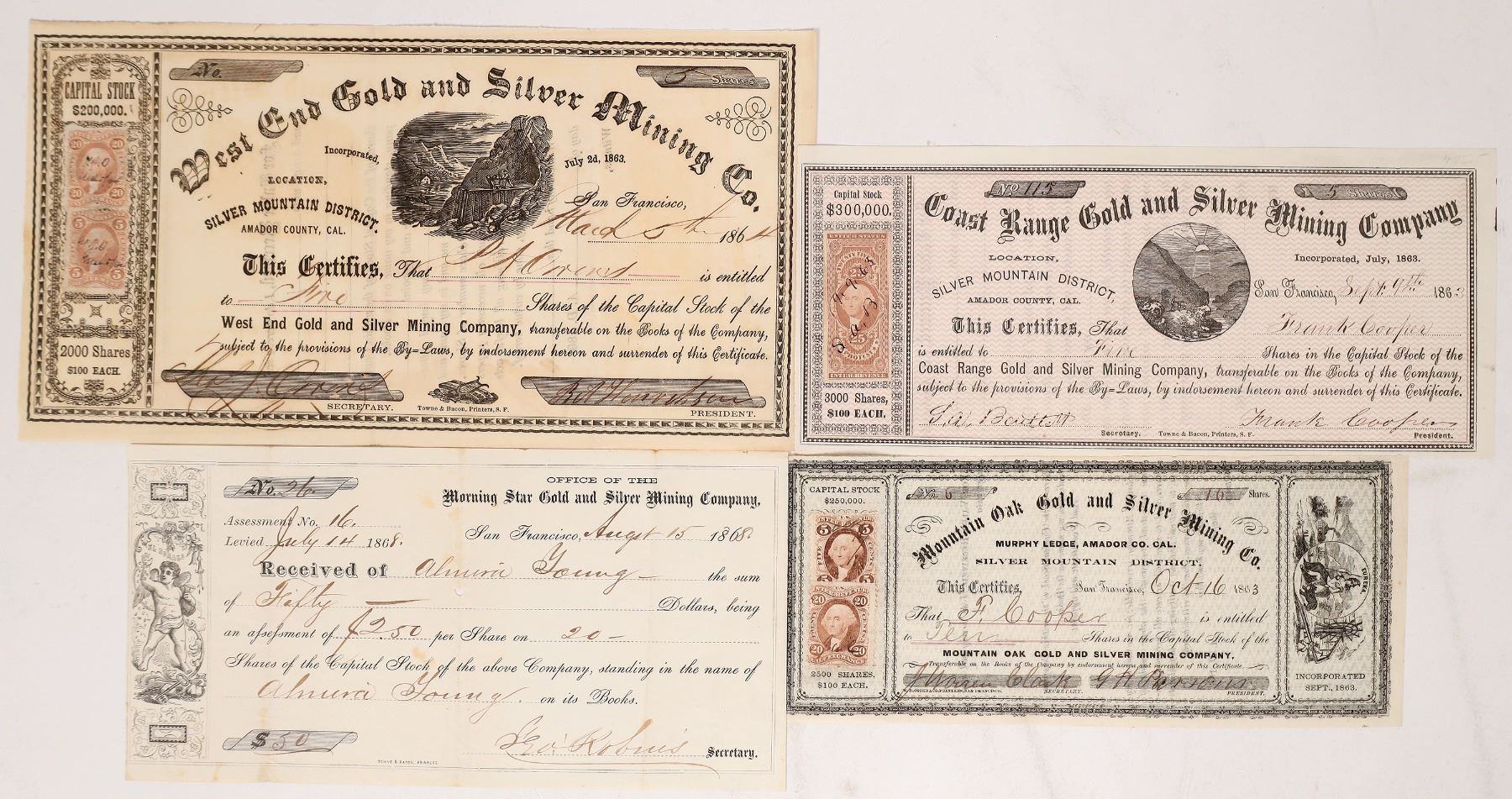 4x Certificates of stock from various Mining Companies in the Alpine & Amador County,  Silver Mountain District, California.