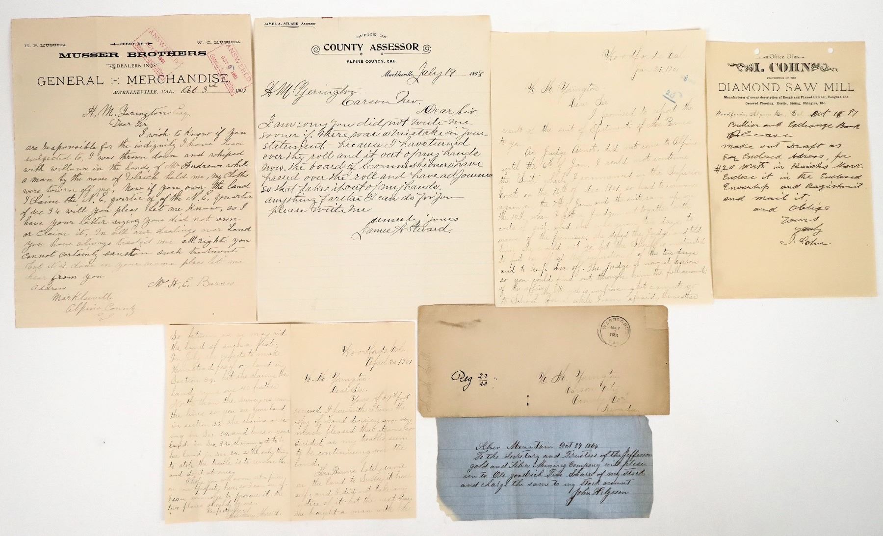 Six Alpine county letterheads. 1901 Woodfords-1 with cover, 1864 short Silver Mountain, 1898 and 1901 Markleeville, 1899 Woodfords billhead.