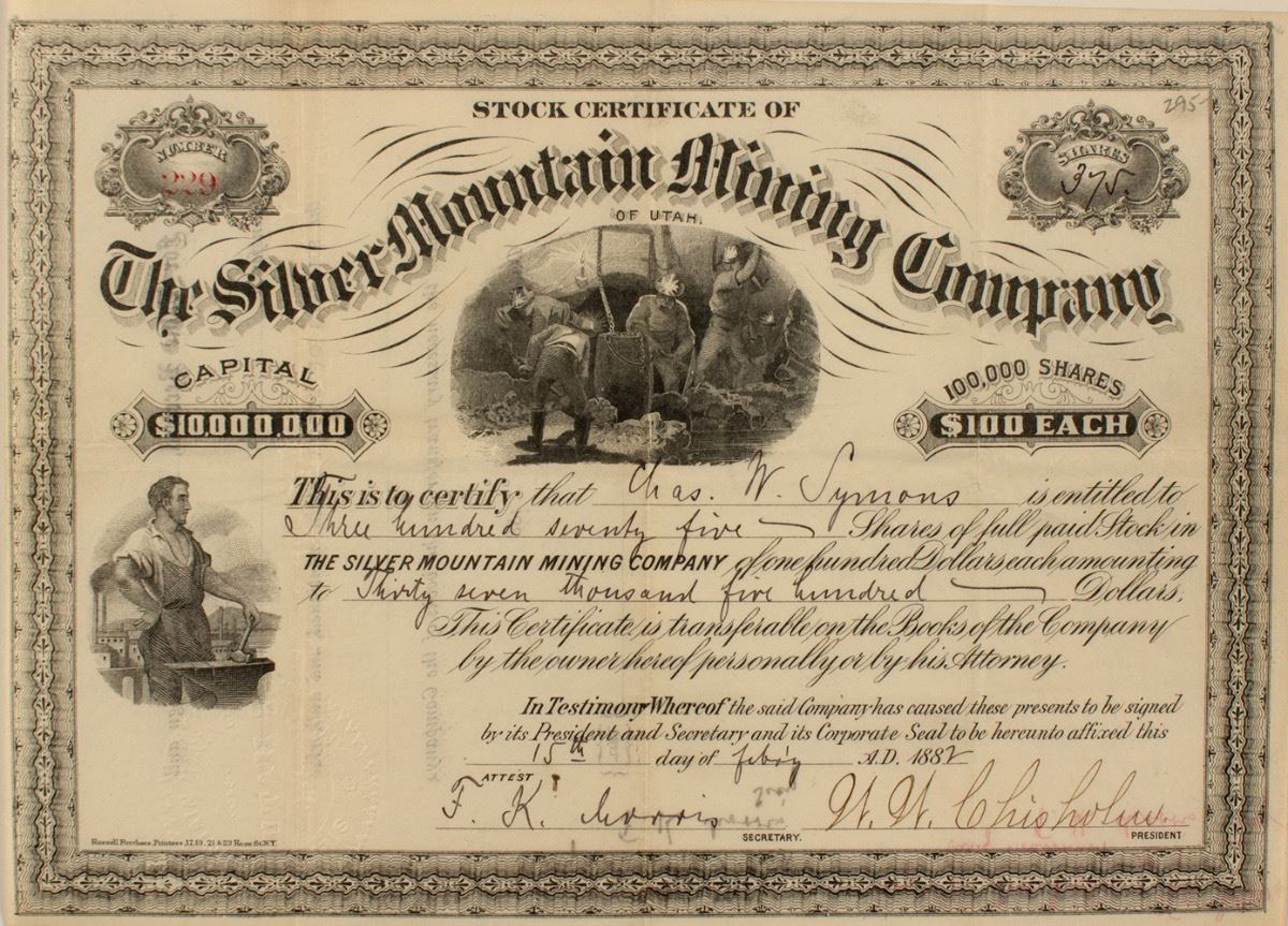 Number 229 for 375 shares in 1882. To Charles Lyman signed by WW Xhisholm and FK (?). (Prag collection) City: State: Utah Date: 1882 hwac# 23753