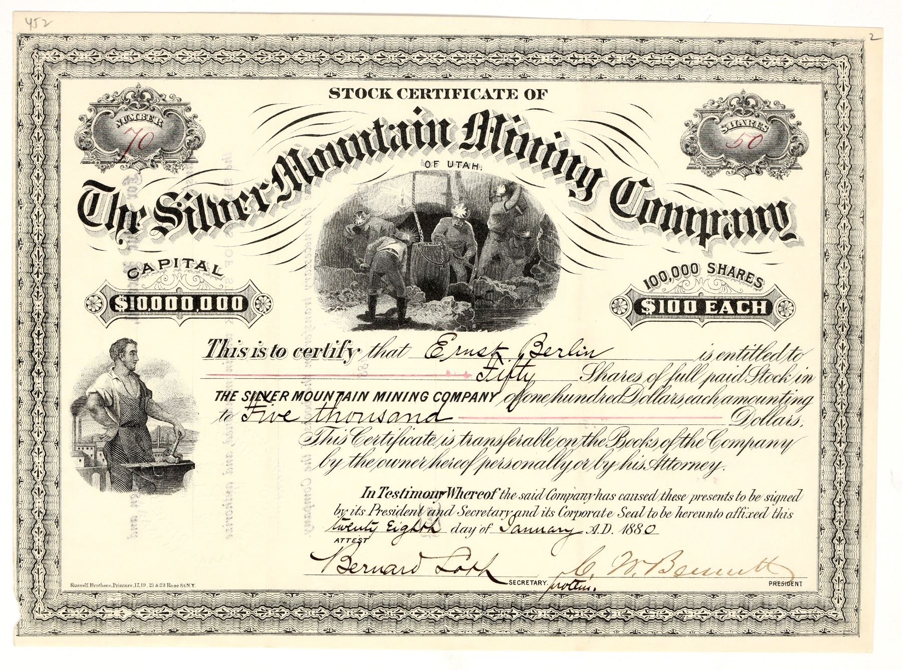 No. 70, issued for 50 shares to Ernst Berlin in 1880. Signed by the president and secretary. Not cancelled. Black border and print with two vignettes: mine hoisting scene and blacksmith. Folds, small piece missing on lower left. 7.25 x 9.75" This company's mine was located on Kessler Peak north-northwest of Alta, Salt Lake County. They owned the Silver Mountain No. 2, Lone Pine, Frisco Mining Claim, Osceola, Big Cottonwood District, Salt Lake County (Salt Lake Herald, Jan. 10, 1880).