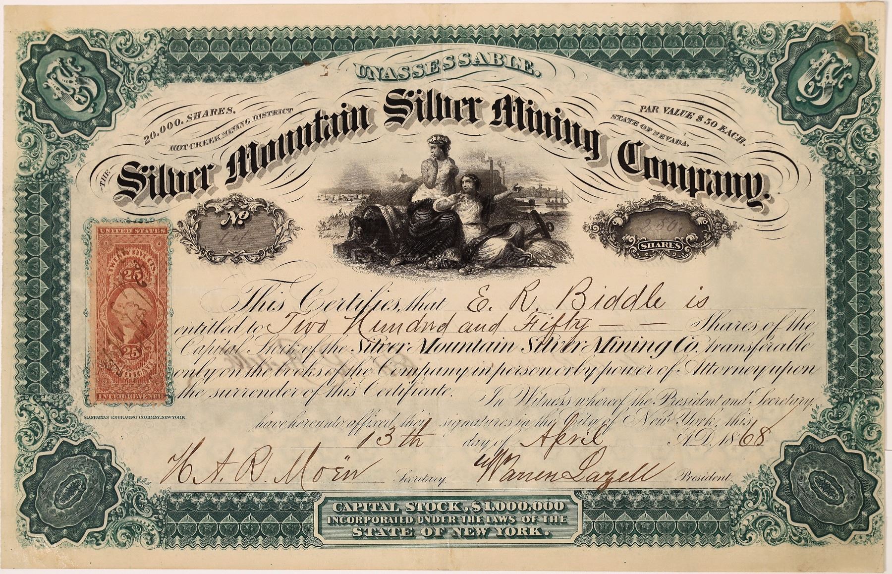 Rare. "Hot Creek Mining District, State of Nevada" (printed above title). Inc. in New York. No. 14, issued to ER Biddle for 250 shares on April 13th, 1868 in New York. Signed by president Warren Lazell and secretary HAR Moen. Not cancelled. Green border, black print, and allegorical vignette. 25 cent IR stamp attached at left. 6 x 9.5" Folds, tape repaired tear at corner. The Hot Creek was also known as the Tybo Mining District and was located in Nye County at Tybo and Hot Creek in the Hot Creek Range. The Hot Creek section of the district was discovered in 1866 with the help of a Native American. By 1868, there were two 10-stamp mills operating. No additional information located about this company. No articles found in online newspaper databases. Not listed in Filer. [Ref: Mining Districts and Mineral Resources of Nevada, Lincoln]