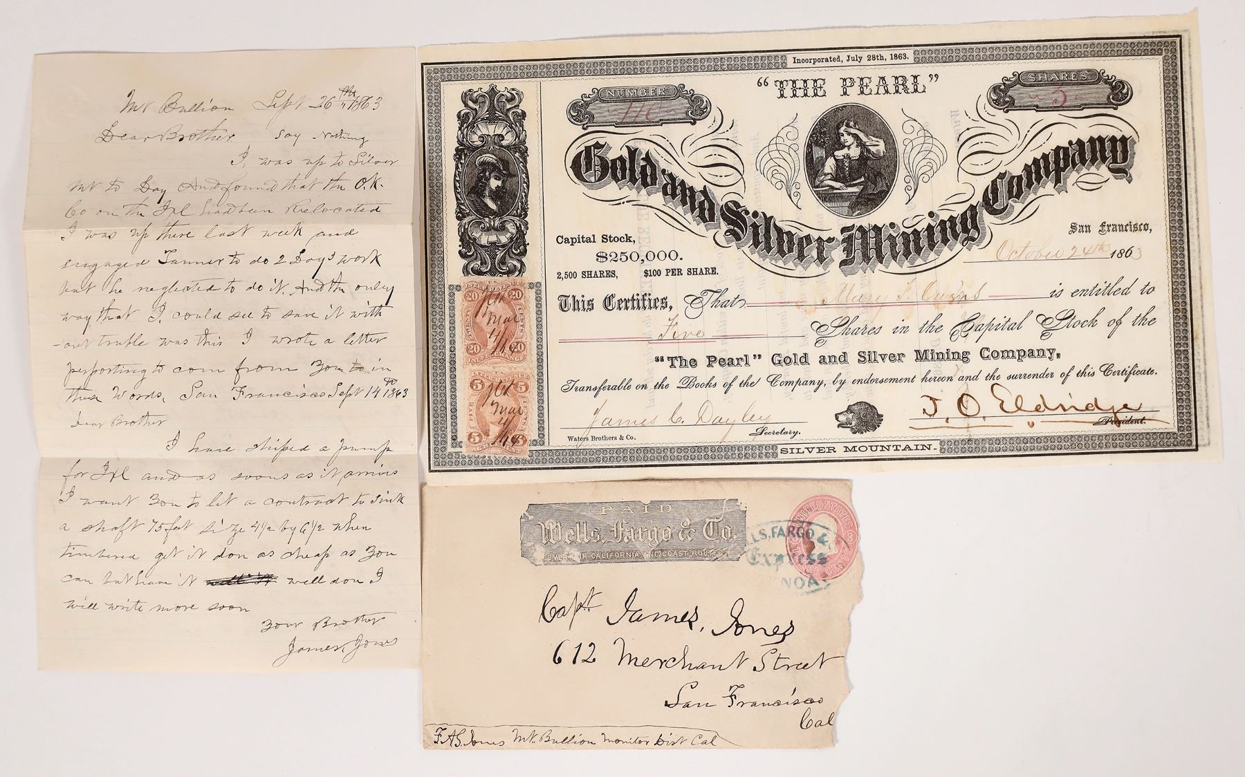1) "The Pearl" Gold and Silver Mining Company Stock; Mine in Silver Mountain, later renamed Oro Grande in Mojave Desert. #110 i/u Mary F Owens 1863 5 shares. The dateline is San Francisco. Signed by President J. (James) O. (Oscar) Eldridge and Secretary James C. Dayley. Three vignettes: one of young girl with left hand to head top center, a second of a dog’s head at bottom center and a third of a woman with a fancy hat at left. A brown 25 cent Internal Revenue Certificate stamp attached. Black on white; 5.25 x 9.25 inches, printed by Waters Brothers & Co. The Silver Mountain camp was probably discovered in the late 1850's but no intense activity until 1863. Ref. James O. Eldridge is listed in Langley’s San Francisco Directory for 1865 (p. 166 & 366) as working for the firm of H. M. Newhall & Co., auction and commission merchants. The firm was located on the SW corner of Sansome and Halleck Streets. He was also identified as President of the S. F. and San Jose R. R. Co. James C. Dayley is also listed in the same directory (p. 145) as a mining secretary at 338 Montgomery and residing in Oakland.