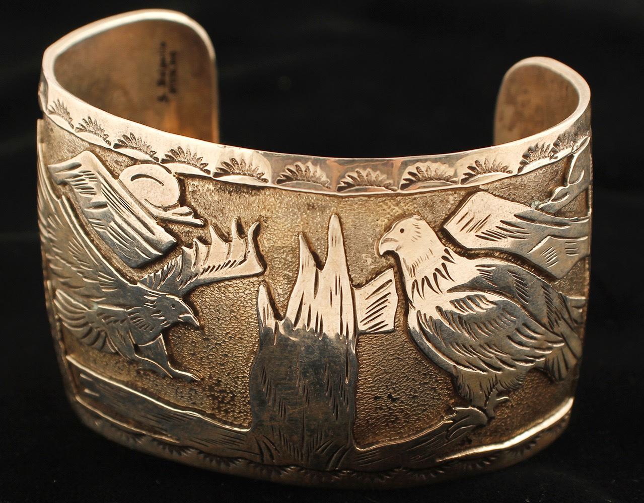Gorgeous heavy sterling silver Navajo cuff depicting 1 perched eagle & 1 in flight. This exquisite piece measures 2” wide a nicely trimmed border & finished off at the ends of the cuff as well. This is a signed piece by known silversmith Delgarito. HWAC# 62038 Date: Location: