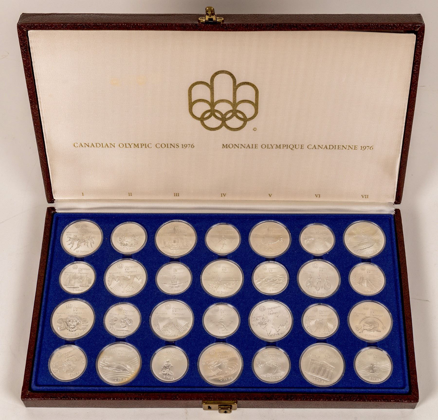 In original case (16 x 9 x 2 inches) with documents: 28 silver coins commemorating the Olympics held in Montreal in 1976. All the coins are 92.5% silver and 7.5% copper alloy. Fourteen $5 coins (38 mm, .72 troy oz. fine silver) and fourteen $10 coins (45 mm, 1.44 troy oz.) Over 30 ounces of silver! Canada