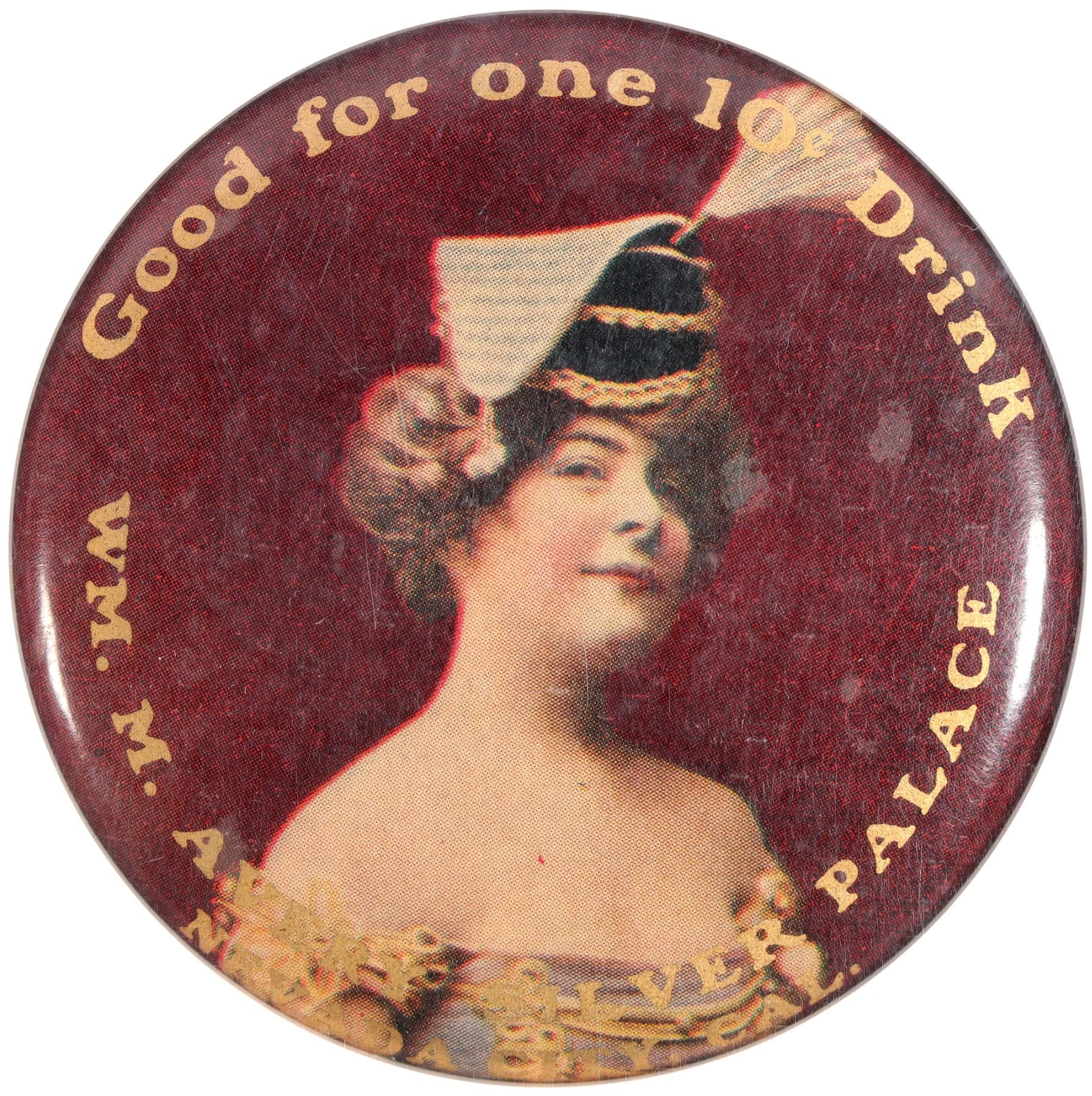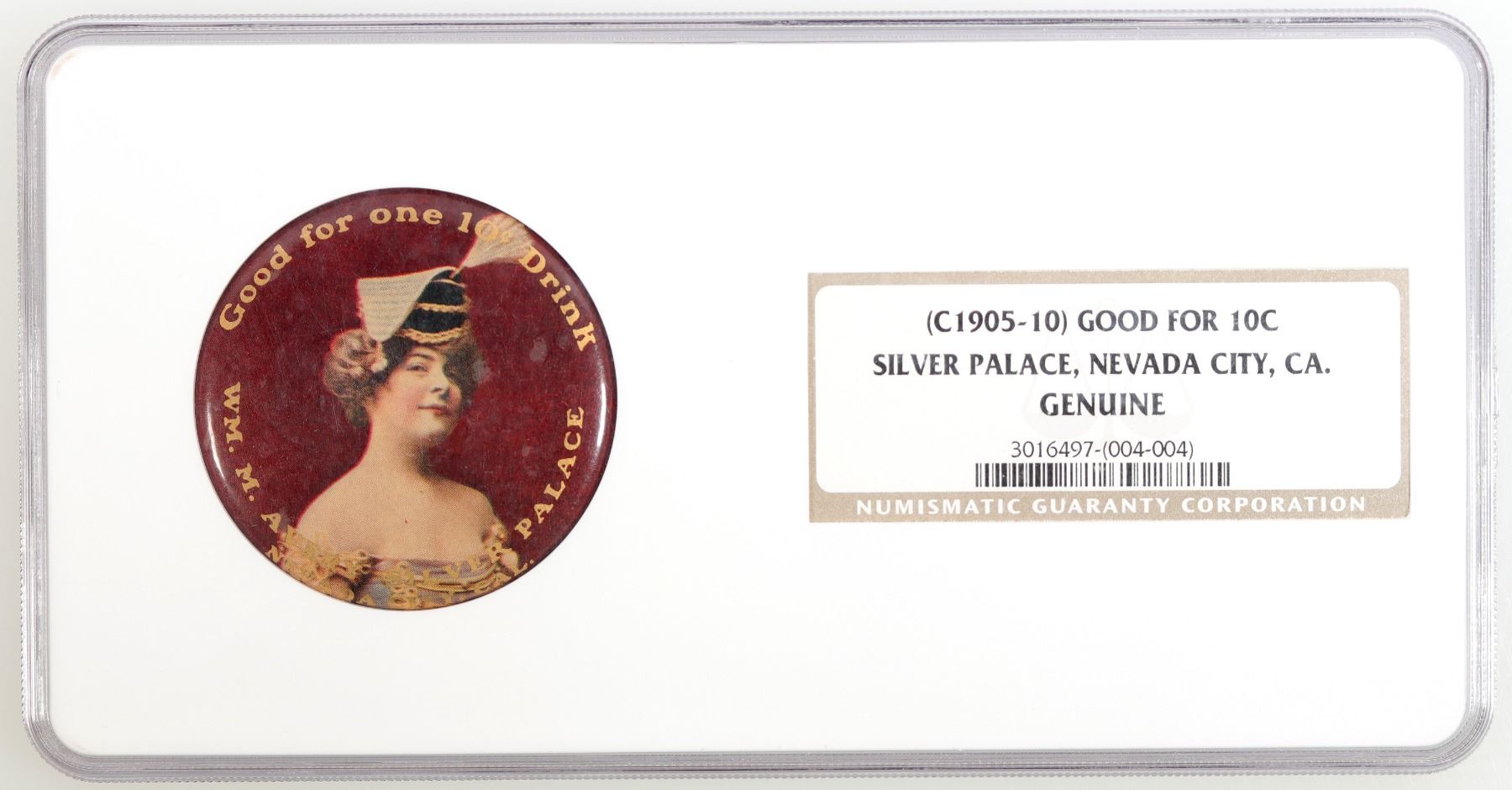 Good For one 10c Drink / WM. M. Avery Silver Palace / Nevada City, Cal. Advertising Mirror (Pocket sized) 2.25" Excellent condition. Encased by NGC. Extremely Rare and highly collectible piece. Nevada City California c1905-10
