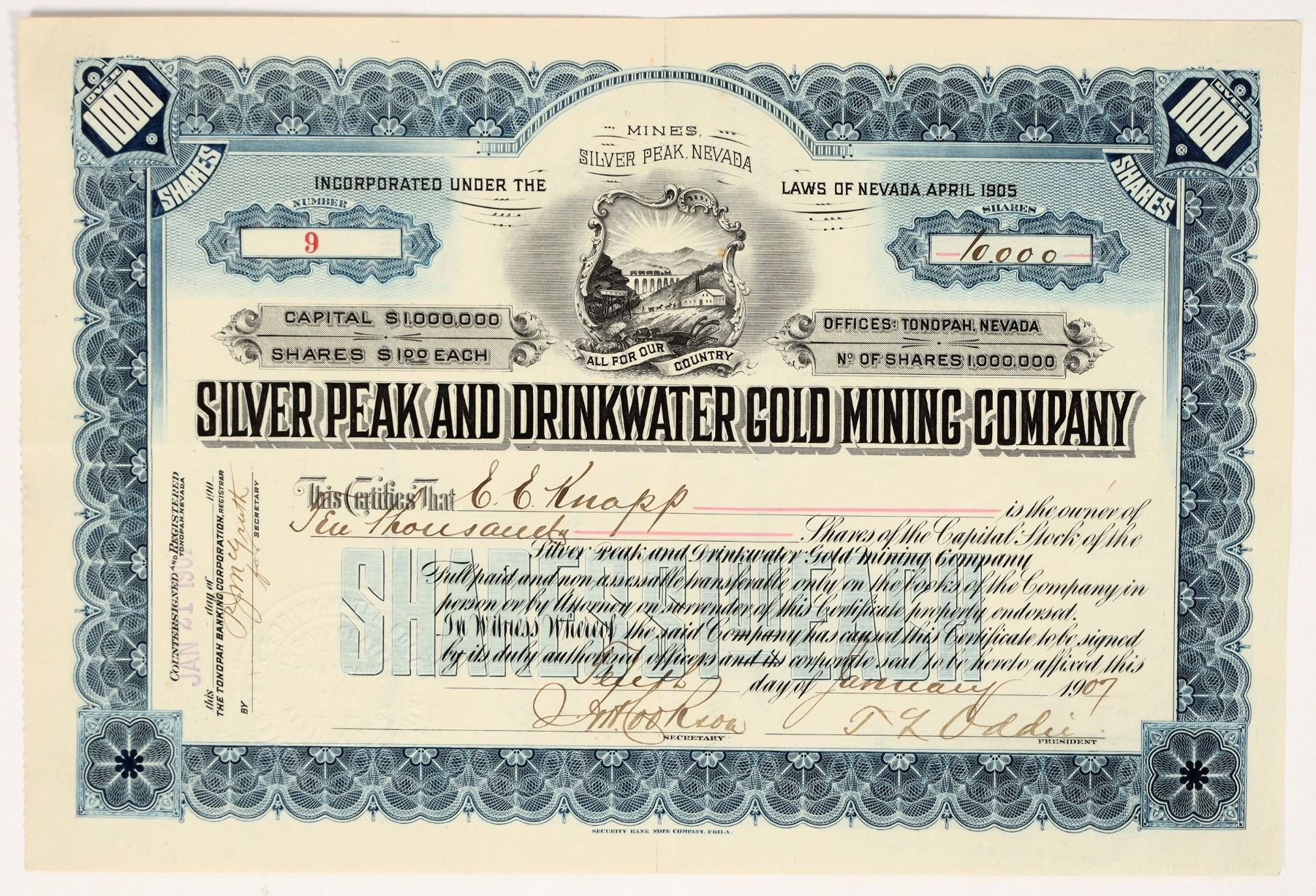 "Mines, Silver Peak, Nevada" (printed at top center). Inc. in Nevada, 1905. Low number 9, issued to EE Knapp in 1907. Signed by Tasker Oddie as president and the secretary. Not cancelled. Blue border, black print, and Nevada state seal vignette. Southern Bank Note Co. Clean. 7.5 x 11" The Drinkwater mine was located five miles northwest of Silver Peak, Esmeralda County. Oddie was the future 12th governor of Nevada (1911-1915) and US Senator (1921-1933). Very rare.